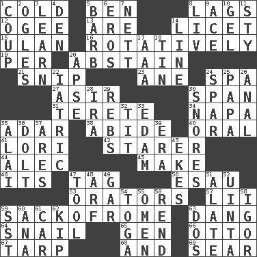 ACROSS 1. Having a low temperature 5. Benjamin's nick name 8. Straggles 12. Double curve, resembling the letter S 13. "We ___ not amused" (Victoria) 14. It is permitted: Lat. 15. ____ Bator 16. Happening in regular succession 19. For each 20. Refrain by choice 21. Sever or remove by pinching or nipping 23. One (Scot) 24. Health resort 27. SW Saudi Arabia district 30. Connect, as a bridge 31. Cigar-shaped 34. California wine valley 35. The sixth month of the Jewish calendar 38. Tolerate 40. Spoken 41. Australian parrot (variant) 42. A viewer who gazes fixedly 44. Actor Baldwin 45. Cause to be 46. ___ a Wonderful Life 47. Label 50. Son of Isaac 53. Speakers 57. Cards in a Roman deck? 59. Italian handbag shop? 63. Mild oath, euphamism for damn 64. Slow-paced one 65. Commissioned military rank (abbr.) 66. "Beetle Bailey" pooch 67. Canvas cover 68. Added to 69. Shrivel DOWN 1. Clever action or accomplishment 2. Stares 3. Memorize 4. Lair 5. Sharp remark 6. Greek god of love 7. Remaining after all deductions 8. 54 in ancient Rome 9. Adept person 10. Set 11. Filthy place 14. Actor's bit 17. American Automobile Association (abbr.) 18. Shallow baking pan 20. Domed church section 22. Of or pertaining to medicine 24. Practice fight 25. Dad 26. Of or related to the anus 28. Lyricist Gershwin 29. Confederate soldiers (slang) 30. Sounds asleep 32. Teat (slang) 33. Dutch treat 35. Mountain range southwest of Kyrgyzstan 36. Dunce 37. Ancient Greek god of war 39. Period 43. Makes supply last 47. Implement 48. Sandy's bark 49. Slender fish 51. Having winglike extensions 52. National forest in Provo, Utah 54. Ancient Roman robe 55. Sign of things to come 56. Tear apart 58. Russian composer Stravinsky 59. Fast jet (abbr.) 60. Santa ___, CA 61. Automobile 62. Monetary unit of Laos 63. Two (Sp.)
