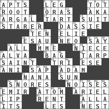 ACROSS 1. Tenement units (abbr.) 5. Part of a journey 8. Small child 11. Carrot, for example 12. Mouths or openings 14. Alias (abbr.) 15. Therefore, facetiously 17. Small pie 18. Costume for a special activity 19. A viewer who gazes fixedly 21. Hyrax 23. "___ Little Indians" 25. Writer Wiesel 26. Son of Isaac 27. Modern: prefix 28. Declare 31. 100% 33. Madame (abbr.) 35. Sibling's daughter 37. Inventor's middle name 38. Paper or plastic container 40. Canvas cover 41. Virtuous person 43. Three (prefix) 45. Compass dir. 46. Cuckoo 47. Plant excrement 50. First of billions? 52. Nanny 53. Player for Phoenix 54. Sounds asleep 56. Annoying sounds 61. Arab leader 62. Smallest unit of an element 65. Satellite of Uranus 66. Mouth edge 67. Monthly bill 68. Silent film actress Nazimova 69. It is 70. French article 71. A home for chicks DOWN 1. Caspian sea tributary 2. Left side of a ship or aircraft 3. Ancient Roman robe 4. Play the lead 5. Car dealer's back yard 6. Epoch 7. Place where plants grow 8. "Change" in Tahitian 9. Migrant worker of the '30s 10. Make lace 13. Having lost freshness 16. Allows 18. Compass dir. 20. 480, 500 or 516 sheets of paper 22. The Jewish people; Israel 24. Unfeeling 26. Flair 28. Oceans 29. Measure of real estate 30. Slangy assent 31. ____ Jay Lerner 32. 57 in ancient Rome 34. Ingest 36. Detail 37. White ___ sheet 39. Pate de foie ____ 42. Russian ruler of old 44. Goddess of spring and wife of Bragi 48. Approach 49. Soft color 51. Small Philippine buffalo 52. Not either 54. Stricken, poetically 55. Pinches, bites 57. SW Asia republic 58. Filth; sediment 59. Snakelike fish 60. Narrow board 61. Biblical high priest 63. Single 64. Mountains (abbr.)