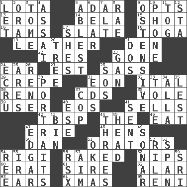 ACROSS 1. Globular water bottle used in Asia 5. The sixth month of the Jewish calendar 9. Chooses 13. Greek god of love 14. Actor Lugosi 15. Went for two points 16. Scottish caps 17. Chalkboard 18. Ancient Roman robe 19. Cordwainer's material 21. Lair 22. Angers 23. Went 24. Hearing organ 27. Eastern Standard Time (abbr.) 28. Backtalk 29. Streamer paper 31. A really long time 32. Slanted text style (abbr.) 36. Western Nevada city 37. Music discs 38. Short-tailed, large-bodied rat 39. One who makes use of a thing 40. Greek goddess of the dawn 41. Exchanges for money 42. Cook's measure (abbr.) 44. Definite Article 46. Ingest 47. 4th largest of the Great Lakes 48. Coop moms 50. Daniel's nick name 51. Speakers 54. Swiss mountan, "Queen of the Mountains" 56. Moved through 58. Pinches, bites 60. Part of Q.E.F. 61. Beget 62. Having or resembling wings 63. Hearing organs 64. Dec. holiday 65. Painter Guido (1575-1642) DOWN 1. Allow 2. Taken by mouth 3. Heavy book 4. Slender Brazilian palm 5. Most capable 6. Letter starter 7. The first octave above the treble staff 8. Actress Charlotte 9. Clearly or manifestly demonstrative 10. Give a jingle 11. Coat; cloak 12. R.R. building 17. "______ My Girl" (Turtles hit) 20. Woody plant 21. Two (Sp.) 23. Separate the seeds from cotton 24. Shade of tan 25. Ancient Greek god of war 26. French philosopher Descartes 28. Distress signal 30. Likenesses of persons 31. Begley and Asner 33. Lacquered or enameled metalware 34. Silent film actress Nazimova 35. For fear that 37. Police officer (slang) 40. Compass dir. 41. Transmitted 43. Storage container 44. Triplets 45. Froth on beer 47. _ Allan Poe 49. Echolocation 51. Gumbo ingredient 52. Cause heat under the collar 53. Connect, as a bridge 54. To separate or throw off 55. Lyricist Gershwin 56. Acura sports coupe 57. Direct toward a target or goal 59. _ Lanka