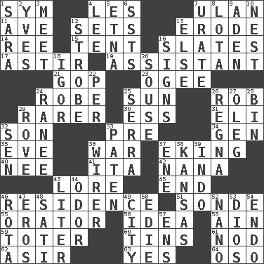 ACROSS 1. Symbol (abbr.) 4. French article 7. ____ Bator 11. "___ Maria" 12. Puts into a specified state 13. Wear away 14. To sift 15. Portable shelter 16. Chalkboards 17. Moving about 19. Helper 21. Republican Party 23. Double curve, resembling the letter S 24. Loose flowing garment 25. Player for Phoenix 26. Director Reiner 29. More valued for its uncommonness 30. Double-curved letter 31. Biblical high priest 32. Male child 33. Before (prefix) 34. Commissioned military rank (abbr.) 35. Night before a holiday 36. Armed conflict 37. Supplementing with great effort 40. Born 41. Call ___ day 42. Grandmother 43. Old wives' tales, e.g. 45. Conclusion 46. Dwelling 51. Message 55. Speaker 56. The main thing one is thinking about 58. The 18th letter of the Arabic alphabet 59. Carrier 60. Canisters 61. Allow head to fall sleepily 62. SW Saudi Arabia district 63. Consenting reply 64. Bear (Spanish) DOWN 1. "Two Mules for Sister ____" 2. Jacques Cousteau's middle name 3. Rendezvous 4. Area sheltered from the wind 5. Inactive volcano in Sicily 6. Fast planes 7. A salt of uric acid 8. Globular water bottle used in Asia 9. An important port of Yemen 10. Egg locale 12. Disco prop 13. Otherwise 16. Signals 18. Composer Stravinsky 20. Lush 22. For each 24. The wife of a rajah (variant) 25. Spanish missionary in California 26. Rain (Swedish) 27. Cassini of fashion 28. Storage container 29. Be footloose 32. Elected rep. 33. Eucharist need 36. One who wires 37. Compass dir. 38. Sunflower state 39. Southeast Asian peninsula 43. 61 cubic inches 44. Scent 46. Round or rotation of duties 47. Greek god of love 48. Suttee (variant) 49. Municipality 50. Singer Brickell 52. Billionth: prefix 53. "Vaya con ____" 54. Inside; within (prefix) 57. Followers of ems