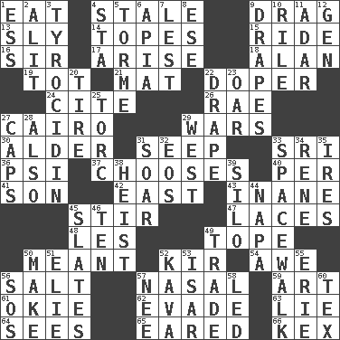 ACROSS 1. Erode 4. Having lost freshness 9. To trail on the ground 13. Cunning 14. Drinks excessively 15. Travel on or in a vehicle 16. Title for a knight 17. Ascend 18. ____ Jay Lerner 19. Small child 21. Floor covering 22. Drug addict 24. Quote 26. Actress Charlotte 27. Capital of Egypt 29. Armed conflicts 30. Tree or shrub in the Birch family 31. Ooze 33. _ Lanka 36. Air pressure measure (abbr.) 37. Elects 40. For each 41. Boy, to dad 42. 90 degrees 43. Silly 45. Tumult 47. Shoestrings 48. French article 49. Drink excessively 50. Intended 52. Apertif with cassis 54. Deep reverence 56. Table seasoning 57. Relating to the nose 59. Tate display 61. Migrant worker of the '30s 62. Dodge 63. Falsehood 64. Perceives with the eye 65. Having ears or earlike features 66. Dry husk or covering DOWN 1. Double-curved letter 2. Came down and settled, as after flight 3. Polypeptide antibiotic 4. R.R. building 5. Singer Mel 6. Capital of Western Samoa 7. For fear that 8. Compass dir. 9. Window treatments 10. Cause heat under the collar 11. The sixth month of the Jewish calendar 12. Commissioned mil. rank 20. Become fatigued 22. Window treatment 23. Boat paddle 25. Torque (variant) 27. Smile enhancers 28. In addition 29. 270 degrees 31. Fly high 32. Greek goddess of the dawn 33. High altitude stroll 34. French philosopher Descartes 35. Angers 38. Robbery 39. Grain storage tower 44. California wine valley 45. Chalkboards 46. "___ Little Indians" 49. Barter 50. Create 51. Writer Wiesel 52. Polynesian shrub of the pepper family 53. Austrian river, tributary to the Danube 55. One of the Great Lakes 56. Distress signal 57. Born 58. Directed 60. John Ritter's dad