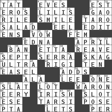 ACROSS 1. Make lace 4. Nights before holidays 8. Eastern Standard Time (abbr.) 11. Greek god of love 13. Ms. Damita and namesakes 15. E Mali city 16. Cause heat under the collar 17. Grin 18. Pacific island yam 19. Vegetable dish 21. Snakelike fish 22. Prepare for publication 23. Followers of ems 24. Solemn pledge 27. Opposite of masc. 29. Pulitzer Prize-winning author Ferber 30. Showery time 34. Bar 36. Singer James 39. Break or tear apart 40. Back-to-school mo. 41. Father Junipero _ 43. Heroin 44. Extremist 46. Swiss mountan, "Queen of the Mountains" 47. "___ Little Indians" 48. Artist's stand 49. Sums up 51. In the manner of 53. Area sheltered from the wind 54. Single 57. Narrow board 60. Car dealer's back yard 63. Make _____ (do battle with) 65. Suggestive of the supernatural 66. From or relating to Ireland 69. Narrow opening 70. Compass dir. 71. Tarsus (plural) 72. Airs 73. Parent Teacher Assoc. 74. Allows 75. For each DOWN 1. Laconic 2. Believer in; advocate of (suffix) 3. For Whom the Bell _____ 4. Raised railways 5. Zeal 6. Writer Wiesel 7. Drop; flow; fall 8. Mild oath 9. Indian skirt 10. A blast of a horn 12. Ocean 14. Itself 18. Storms 20. Movie disc 25. Singles 26. Wetness 28. Hearing organ 29. Plea 31. Immoral or dissolute person 32. _ the terrible 33. Part of a journey 34. Actor Lugosi 35. Flats, for short 37. Three (prefix) 38. Therefore, facetiously 40. Take to court 42. Helper 45. Everything 50. Morning condensation 52. Came down and settled, as after flight 54. Fourth or lowest deck 55. Trap for birds or small mammals 56. Keyboard key 57. Ooze 58. For fear that 59. Type of rug 61. Relating to the mouth 62. Hoop that covers a wheel 64. Cleo's killer 67. Fast jet (abbr.) 68. Part of HMS, perhaps