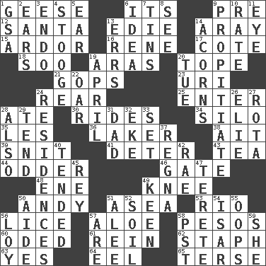 ACROSS 1. Honkers 6. It is 9. Before (prefix) 12. Before Barbara or Clara 13. Singer Brickell 14. Like ___ of sunshine 15. Zeal 16. French philosopher Descartes 17. ____ d'Azur (French Riviera) 18. "Barney Miller" actor Jack 19. Ancient river in northeast Turkey 20. Drink excessively 21. Republicans 23. RI univ. 24. Rump 25. Keyboard key 28. Had dinner 30. Amusement-park features 34. Grain storage tower 35. French article 36. Member of a famous L.A. basketball team 38. Small island 39. In a ____ (agitated or irritated) 41. Prevent from occurring 43. Beverage made from leaves 44. More peculiar 46. Yard entry 48. Compass dir. 49. Leg joint 50. Actor Griffith 51. Toward the sea 53. _ de Janeiro 56. Louse (plural) 57. _ vera 58. Mexican monetary units 60. Wrote a lyric poem 61. It's straight from the horse's mouth 62. Staphylococcus 63. Affirmative reply 64. Snakelike fish 65. Laconic DOWN 1. Girls' org. (abbr.) 2. Hearing organs 3. Inside; within (prefix) 4. Moe Howard, for one 5. Hearing organ 6. The main thing one is thinking about 7. Metal containers 8. Perceive with the eye 9. Conciliate 10. Pace 11. Sight organ 13. Blunders 14. Oak nuts 19. Showery time 20. Third day of the wk. 22. Rowing implement 24. Homes 26. Writer Wiesel 27. Roll call or roster of names 28. In addition 29. Look after 31. June honoree 32. Make supply last 33. Put into a specified state 37. Rain (Swedish) 40. Watched over 42. Actress Charlotte 45. Marina Del _, California 47. Cigar-shaped 49. Peachy ____! 50. Assistant 51. Toward shelter 52. The visible part of the earth's surface 54. Austrian river, tributary to the Danube 55. I made a mistake 56. Myrna of the movies 57. "We ___ not amused" (Victoria) 58. Pacific Standard Time (abbr.) 59. A female animal or person