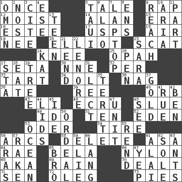 ACROSS 1. At one time in the past 5. Story 9. Strike 12. Wet 14. ____ Jay Lerner 15. Epoch 16. First name in cosmetics 17. United States Postal Service (abbr.) 18. Atmosphere 19. Born 20. American author Paul (1891-1958) 23. Scram! 24. Leg joint 25. Brightly colored fish 27. Bristle 30. Compass dir. 32. For each 33. Small pie 34. Stupid person 36. Tired old horse 38. Had dinner 39. To sift 40. Globe 43. Biblical high priest 46. Shade of tan 48. Turn sharply 49. Wedding promise 51. "___ Little Indians" 52. Paradise 53. Baltic tributary 54. Become fatigued 56. Curves 58. Erase 61. White ___ sheet 64. Actress Charlotte 65. Actor Lugosi 66. Thermoplastic polyamide 68. Alias (abbr.) 69. Water falling in drops from the sky 70. Started a card game 71. Elected rep. 72. Cassini of fashion 73. Sliced desserts DOWN 1. Sign of things to come 2. Olfactory organ 3. Quote 4. Compass dir. 5. "Change" in Tahitian 6. In addition 7. Portable computer 8. Followers of ems 9. Arrive at 10. Roberta Peters solo 11. Piece 13. Adolescent 21. Grant temporary use of 22. Poe poem 23. "Two Mules for Sister ____" 24. Krazy ___ of comics 26. Animal enclosure 27. R.R. building 28. Erode 29. Woody plant 31. Choose 35. Cylindrical with tapered ends 37. Precious metal 41. Sorrow 42. Benjamin's nick name 44. Hats (slang) 45. Binary compound 47. A single undivided whole 48. Observe 50. Severe or trying experience 53. Sea 55. Tear apart 56. Caspian sea tributary 57. Immoral or dissolute person 59. Writer Wiesel 60. Long (Scottish) 61. Mountain range southwest of Kyrgyzstan 62. Flatfish 63. Pismires 65. Sis' sibling 67. Slangy assent