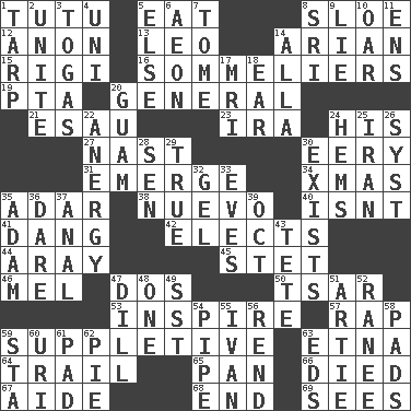 ACROSS 1. Ballerina skirt 5. Ingest 8. A type of plum 12. Soon (poet.) 13. Lion 14. Believer in; advocate of (suffix) 15. Swiss mountan, "Queen of the Mountains" 16. Wine waiters 19. Parent Teacher Association (abbr.) 20. Commissioned military rank 21. He sold his birthright 23. Lyricist Gershwin 24. Part of HMS, perhaps 27. Political cartoonist Thomas 30. Suggestive of the supernatural 31. Develop 34. Dec. holiday 35. The sixth month of the Jewish calendar 38. New (sp.) 40. Is not 41. Mild oath, euphamism for damn 42. Chooses 44. Like ___ of sunshine 45. Proofreading order 46. Cartoonist voice _ Blanc 47. Two (Sp.) 50. Russian ruler of old 53. Motivate 57. Hit sharply and swiftly 59. Supplying deficiencies 63. Inactive volcano in Sicily 64. Get behind 65. Baking dish 66. Passed on 67. Helper 68. Conclude 69. Perceives with the eye DOWN 1. Canvas cover 2. Join together 3. Ancient Roman robes 4. Corn or form start 5. Otherwise 6. Period of immesurable duration 7. Heavy book 8. Indian title of respect (Mr.) 9. Whopper 10. Rowing implement 11. Followers of ems 14. Silent film actress Nazimova 17. Medical imaging device (abbr.) 18. Hearing organ 20. Island territory of the United States 22. Disorder of the immune system 24. Cloth borders 25. SW Asia republic 26. System (abbr.) 28. Elected rep. 29. Loyal 30. Is 32. Set 33. Nights before holidays 35. First of billions? 36. Have the gumption 37. Of or related to the anus 39. Sep. follower 43. False hair 47. Deli pickle 48. Single 49. Fast jet (abbr.) 51. Nick name for Arthur 52. Indian princess (variant) 54. Corncob 55. _ the terrible 56. Tear apart 58. Writing tablets 59. R.R. building 60. RI univ. 61. Groovy apt. 62. Sliced dessert 63. Begley and Asner
