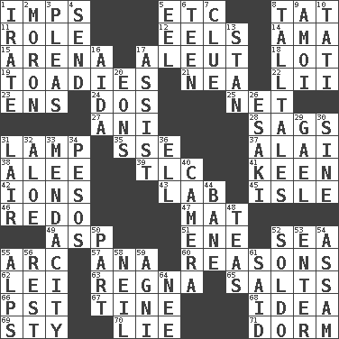 ACROSS 1. Naughty children 5. And so on (abbr.) 8. Make lace 11. Hero or heavy, e.g. 12. Snakelike fish 14. Wet nurse (var.) 15. Sports stadium 17. Native American of Southwest Alaska 18. Car dealer's back yard 19. Sycophants 21. Teachers' org. 22. Cards in a Roman deck? 23. Followers of ems 24. Two (Sp.) 25. Fish or hair follower 27. Cuckoo 28. Droops 31. Desk light 35. Compass dir. 37. Jai ____ 38. Toward shelter 39. Affectionate concern, for short 41. Peachy ____! 42. Charged particles 43. Experiment locale 45. Capri or Wright 46. Make new 47. Floor covering 49. Viper 51. Compass dir. 52. Ocean 55. Curve 57. Santa ___, CA 60. Thinks logically 62. Flowery wreath 63. Rain (Swedish) 65. Table seasonings 66. Pacific Standard Time (abbr.) 67. Prong on a fork 68. It may be bright or harebrained 69. Filthy place 70. Falsehood 71. Dormintory (informal) DOWN 1. Feeling or showing extreme anger 2. Person of subnormal intelligence 3. Entreaties 4. Post 5. Snakelike fish 6. Adolescent 7. A slight indication 8. Baron Munchausen's specialties 9. Mine, in Marseilles 10. Jacques of French films 13. Comedian Laurel of Laurel & Hardy 16. Opera by Verdi 17. Aid 20. Immeasurably long periods of time 26. 1973 Nobel Price Winner (Physics) Leo 29. Highlander 30. Trig term 31. Den 32. Medicinal plant 33. Ananias' fault 34. Mexican monetary units 36. Pipe bend 40. Device for capturing images 44. Object of repulsion 48. Beverages made from leaves 50. Piece 52. Twentieth part of a lira 53. Keyboard key 54. Indian state 55. High mountains 56. Relief 58. Famous astronaut Armstrong 59. Hindu god of fire 61. Stated 64. Born