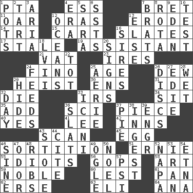 ACROSS 1. Parent Teacher Association (abbr.) 4. Curvy letter 7. Cy Young winner Saberhagen 11. Rowing implement 12. Mouths or openings 13. Eat (away) 14. Three (prefix) 15. Draw slowly or heavily 16. Chalkboards 17. Having lost freshness 19. Helper 21. Large container 23. Angers 24. A pale, very dry sherry 25. Personal question 26. Morning condensation 29. Robbery 30. Followers of ems 31. Binary compound 32. Pass on 33. Big collection agency 34. Be seated 35. Increase 36. _-fi 37. Component 40. Affirmative reply 41. Area sheltered from the wind 42. Restaurants 43. Examine minutely or intensely 45. Ovum 46. Drawing lots 51. Bert's buddy 55. Foolish or stupid persons 56. Republicans 58. Tate display 59. Having high moral qualities 60. For fear that 61. Baking dish 62. Celtic language 63. Biblical high priest 64. Santa ___, CA DOWN 1. Cooking vessels 2. Small pie 3. Roberta Peters solo 4. Epoch 5. "Two Mules for Sister ____" 6. Fast planes 7. Naughty children 8. Roll call or roster of names 9. Genesis locale 10. Trial 12. Seas 13. Otherwise 16. Founders of families 18. 57 in ancient Rome 20. Public displays of written messages 22. Small child 24. Eats 25. Nest on high 26. Plates 27. Singer Brickell 28. Soggy 29. Flintstone garb 32. 24 hours 33. Ancient Celtic tribe of eastern Britain 36. Narrow boards 37. Sliced dessert 38. Swallow 39. Engineer (abbr.) 43. Fur scarf 44. Quote 46. Trig term 47. Scent 48. Teases 49. Stare 50. Christmas carol 52. California wine valley 53. SW Asia republic 54. Inactive volcano in Sicily 57. Air pressure measure (abbr.)