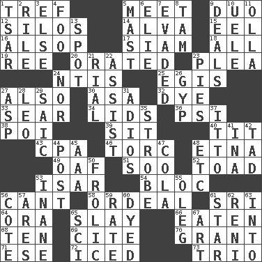 ACROSS 1. Unclean, religiously 5. Rendezvous 9. Superhero pair 12. Grain storage towers 14. Inventor's middle name 15. Snakelike fish 16. Columnist Joseph or Stewart 17. Thailand, formerly 18. 100% 19. To sift 20. Spoke pompously 23. Entreaty 24. Nuclear Threat Initiatives 25. The front part of a cuirass 27. In addition 30. White ___ sheet 32. Color 33. Shrivel 34. Hats (slang) 36. Air pressure measure (abbr.) 38. Luau course 39. Be seated 40. Teat (slang) 43. Numbers guy (abbr.) 46. Torque (variant) 48. Inactive volcano in Sicily 49. Clumsy lout 51. "Barney Miller" actor Jack 52. Frog relative 53. Austrian river, tributary to the Danube 54. Coalition 56. Patter 58. Severe or trying experience 61. Indian title of respect (Mr.) 64. Mouth or opening 65. Kill 66. Eroded 68. Nine, plus one 69. Quote 70. Monetary aid 71. Compass dir. 72. On the rocks 73. Musical group of three DOWN 1. Russian ruler of old 2. Cause heat under the collar 3. Otherwise 4. Egg _ yung 5. Vertical spar for supporting sails 6. Writer Wiesel 7. Dodged 8. Scottish cap 9. Allots cards 10. Ubangi River tributary 11. Spanish pot 13. Blemish 21. Monetary unit of Yemen 22. Help 23. Sliced desserts 24. And not 26. Flimflam 27. Viper 28. Lion 29. Ketch in the Levant 31. Goodbye (Sp.) 35. Disco prop 37. "Tell ____ the Marines!" 41. _ tizzy (2 wds.) 42. Small amount or degree 44. Mail 45. Auto club (abbr.) 47. Root beer relative 48. And so on (abbr.) 50. Play 53. Lacking in sense or substance 55. Cassini of fashion 56. ____ d'Azur (French Riviera) 57. Ancient Greek god of war 59. Assign a rank or rating to 60. Colored 61. Play the lead 62. Painter Guido (1575-1642) 63. To the inside or interior of 65. _-fi 67. Tate display