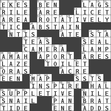 ACROSS 1. Makes supply last 5. Benjamin's nick name 8. Falls behind 12. Cause heat under the collar 13. "We ___ not amused" (Victoria) 14. It is permitted: Lat. 15. Type of rug 16. Rotating or pertaining to rotation 19. Nervous spasm 20. Choose not to consume 21. Nuclear Threat Initiatives 23. Had dinner 24. R.R. building 27. Afternoon social gatherings 30. Lick closed 31. Device for capturing images 34. Desk light 35. Nursemaid 38. To the left, to Queeg 40. Ancient Greek god of war 41. Goldbrick 42. Bathroom plumbing fixture 44. Mouths or openings 45. 43,560 square feet 46. Car or cant ending 47. Atlas unit 50. Fast planes 53. Heighten or intensify 57. Actor Linden 59. Supplementary 63. The longest river in the world 64. Slow-paced one 65. Baking dish 66. Naughty child 67. Event that recurs at intervals 68. Compass dir. 69. Sums up DOWN 1. Part of Q.E.F. 2. Japanese brewing company 3. Voters do this 4. Ocean 5. Sharp remark 6. Greek god of love 7. Remaining after all deductions 8. 54 in ancient Rome 9. Adept person 10. Set 11. Filthy place 14. Actor's bit 17. Auto club (abbr.) 18. Teat (slang) 20. At sea 22. Skin irritations 24. Dry up 25. Not wild 26. High mountains 28. Nanny (var.) 29. Back-to-school mo. 30. Chalkboards 32. Friend of Pooh 33. Operatic vocal solo 35. Medicinal plant 36. Female horse 37. Muslim summons to prayer 39. Affectionate concern, for short 43. Celtic language 47. Place where flour is made 48. One (Scot) 49. Pacific Standard Time (abbr.) 51. One of three equal parts 52. Vegetable dish 54. Corncob 55. "Terrible" tsar 56. French philosopher Descartes 58. Allows 59. Fast jet (abbr.) 60. Single; one (prefix) 61. Groovy apt. 62. Sliced dessert 63. Basketball assoc.