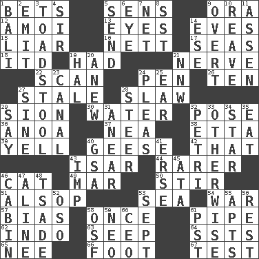 ACROSS 1. Antes 5. Elected reps. 9. Mouth or opening 12. Mine, in Marseilles 13. Sight organs 14. Nights before holidays 15. One who doesn't tell the truth 16. Remaining after all deductions 17. Oceans 18. It would 19. Possessed 21. Effrontery 22. Glance over 24. Writing instrument 26. "___ Little Indians" 27. Showing deterioration from age 28. Cole _ (cabbage dish) 29. The Jewish people; Israel 30. Wetness 32. Introduce or present, as a question 36. Small Philippine buffalo 37. Teachers' org. 38. Singer James 39. Shout 40. Honkers 42. Not this but _ 43. Austrian river, tributary to the Danube 44. More valued for its uncommonness 46. Domesticated feline 49. Impair 50. Agitate 51. Columnist Joseph or Stewart 53. Ocean 54. Armed conflict 57. Prejudice 58. Single time 61. Corncob 62. Southeast Asian peninsula 63. Ooze 64. Fast planes 65. Born 66. One third of a yard 67. Trial DOWN 1. Indonesian resort city 2. Give off 3. Inedible or poisonous agaric 4. Title for a knight 5. Post 6. Sight organ 7. Fish or hair follower 8. Fast jet (abbr.) 9. Unconcealed 10. Break or tear apart 11. NE Netherlands city 14. Compass dir. 19. Actor Linden 20. Afresh 21. Compass dir. 23. Lessep's creation 24. Entreaties 25. Ewer handle 27. Trig term 28. Navigate 29. Declare 31. Approach 32. _ dish (used to culture cells) 33. Else 34. Play the lead 35. Consume 40. Girls' org. (abbr.) 41. Celtic language 43. Naughty child 45. "One Day ___ Time" 46. Small house or cottage 47. Place in a line 48. Sadhe (variant) 52. Bear (Spanish) 53. Back-to-school mo. 55. Flats, for short 56. Take ten 58. Order of Saint Francis (abbr.) 59. Modern: prefix 60. Corporate head (abbr.) 61. Pacific Standard Time (abbr.)