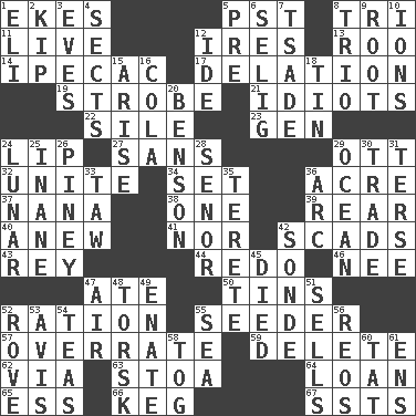 ACROSS 1. Supplements with great effort 5. Pacific Standard Time (abbr.) 8. Three (prefix) 11. Not recorded 12. Angers 13. Friend of Pooh 14. Medicinal drug used to evoke vomiting 17. Accusation by an informer 19. Disco prop 21. Foolish or stupid persons 22. Filth; sediment 23. Commissioned military rank (abbr.) 24. Mouth edge 27. Without 29. Baseball player Mel 32. Join together 34. Put into a specified state 36. Measure of real estate 37. Nanny 38. Single 39. Posterior 40. Afresh 41. Not either 42. Heaps 43. Marina Del _, California 44. Redecorate 46. Born 47. Had dinner 50. Metal containers 52. Food allowance for one day 55. Sowing specialist 57. Make much ado about nothing 59. Keyboard key 62. By way of 63. Portico 64. Grant temporary use of 65. Curvy letter 66. Barrel 67. Fast planes DOWN 1. Biblical high priest 2. Monetary unit of Laos 3. Nights before holidays 4. Religious groups 5. Before (prefix) 6. Former Milwaukee Brewers owner Bud 7. Sadhe (variant) 8. Musical group of three 9. Carrot, for example 10. Charged particles 12. Binary compound 15. Originate 16. Root beer relative 18. Shallow baking pan 20. Gillaume's butler role 24. Type of eclipse 25. Lacking in sense or substance 26. Abounding in pines 28. Sir (Sp.) 29. Sea 30. Exchange 31. Laconic 33. The 23rd letter of the Hebrew alphabet 35. Cigar-shaped 36. Curve 42. Message 45. Passed on 47. Wind 48. Cod relative 49. Related on the mother's side 51. Makes a sale 52. Be footloose 53. Opinion 54. Afternoon social gatherings 55. Ocean 56. Vintage cars 58. Coat; cloak 60. Make lace 61. Followers of ems