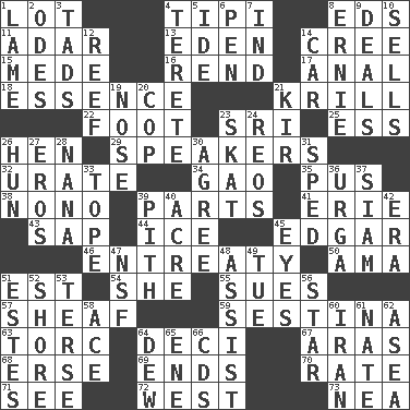 ACROSS 1. Car dealer's back yard 4. Native american tent (variation) 8. Begley and Asner 11. The sixth month of the Jewish calendar 13. Genesis locale 14. Algonquian 15. Ancient Persian 16. Tear apart 17. Of or related to the anus 18. Center 21. Shrimp-like planktonic crustaceans 22. One third of a yard 23. _ Lanka 25. Double-curved letter 26. Layer 29. Orators 32. A salt of uric acid 34. E Mali city 35. Tenth month of the Hindu calendar 38. Words to Nanette 39. Pieces 41. 4th largest of the Great Lakes 43. Plant excrement 44. Frozen water 45. _ Allan Poe 46. Plea 50. Housemaid (var.) 51. Eastern Standard Time (abbr.) 54. A female animal or person 55. Takes to court 57. Archer's quiver 59. French poetic form 63. Torque (variant) 64. Tenth: prefix 67. Caspian sea tributary 68. Celtic language 69. Extremities 70. Assign a rank or rating to 71. Perceive with the eye 72. Compass direction 73. Teachers' org. DOWN 1. Unable to walk 2. Lyric poems 3. Small amounts or degrees 4. Cylindrical with tapered ends 5. Binary compound 6. Fenced enclosure 7. Indiana (abbr.) 8. Bert's buddy 9. Allots cards 10. Exchanges for money 12. Coral ridge 14. Automobile 19. Characteristic smell of wine 20. Police officer (slang) 21. Apertif with cassis 23. Three-handed card game 24. Vintage cars 26. Attila the _ 27. Greek god of love 28. Nanny 30. Match 31. Hurried 33. Drink excessively 36. Capital and largest city of Mongolia 37. Thailand, formerly 39. Essential or central part 40. 1/640 square mile 42. Epoch 45. Sight organs 47. Science/research agcy. 48. Help 49. Third day of the wk. 51. _____ Park, CO 52. Dinah or Pauly 53. Laconic 56. Play the lead 58. Adept person 60. SW Asia republic 61. Nathan's nickname 62. Toward the sea 64. Morning condensation 65. Compass dir. 66. Music discs