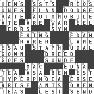 ACROSS 1. Is hesitant and indecisive 5. Fast planes 9. Vintage cars 13. Washington bills 14. Liveliness 15. Evade 16. Pace 17. Car 19. Had dinner 20. "We ___ not amused" (Victoria) 21. Armed conflict 22. Snakelike fish 23. Blunders 25. Symbol (abbr.) 26. Supplementing with great effort 30. Dutch treat 34. More valued for its uncommonness 35. Unable to walk 36. He sold his birthright 39. Staphylococcus 42. Hereditary estate 43. Long dress 44. A special lineage 46. Moves 47. Something which is sent 48. Apple computer (short form) 51. Pulitzer Prize-winning author Ferber 54. Beverage made from leaves 57. White ___ sheet 58. Benjamin's nick name 60. Eastern Standard Time (abbr.) 62. Abnormally rapid or deep breathing 65. Celtic language 66. Originate 67. Pismires 68. Baking chamber 69. Beverages made from leaves 70. For fear that 71. Post DOWN 1. Israeli folk dance 2. Related on the mother's side 3. Distance measurement 4. Compass dir. 5. Scorch 6. Change direction abruptly 7. Make lace 8. Overwhelms 9. Director Reiner 10. Singer Brickell 11. Stare 12. Stitch closed the eyes of (a falcon) 15. Dormintory (informal) 18. Can I? 20. "____ silly question..." 24. Summer TV shows 27. Big collection agency 28. Fish or hair follower 29. Takes hold of 30. Dodged 31. Male parent 32. Wet nurse (var.) 33. Cartoonist voice _ Blanc 36. Oval reproductive body of a fowl 37. "Barney Miller" actor Jack 38. Deep reverence 40. Adept person 41. Layer 45. Locale of original sin 48. Female horse 49. Viper 50. Lessep's creation 52. Impudent aggressiveness 53. NE Netherlands city 54. Not this but _ 55. Jane of fiction 56. Capital of Western Samoa 58. Antes 59. Compass direction 61. Look after 63. Double-curved letter 64. Single 65. Greek goddess of the dawn