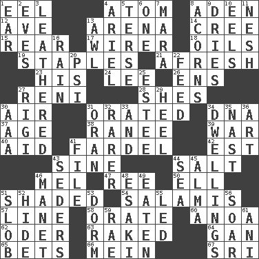 ACROSS 1. Snakelike fish 4. Tiny particle 8. Arabian gulf 12. "___ Maria" 13. Sports stadium 14. Algonquian 15. Located in or toward the back 17. One who wires 18. Lubricates 19. Paper fasteners 21. Anew 23. Part of HMS, perhaps 24. Area sheltered from the wind 26. Followers of ems 27. Painter Guido (1575-1642) 28. "______ My Girl" (Turtles hit) 30. Atmosphere 31. Spoke pompously 34. Heredity factor (abbr.) 37. Ripen 38. The wife of a rajah (variant) 39. Armed conflict 40. Assist 41. Pack 42. Eastern Standard Time (abbr.) 43. Trig term 44. Table seasoning 46. Cartoonist voice _ Blanc 47. Portuguese money of account (variant) 50. Pipe bend 51. Cast a shadow over 54. Deli grouping 57. Actor's bit 58. Speak pompously 60. Small Philippine buffalo 62. River in Europe 63. Moved through 64. Separate the seeds from cotton 65. Antes 66. Count _ (2 wds.) 67. _ Lanka DOWN 1. Ewer handle 2. Nights before holidays 3. Tough but pliablecoriaceous 4. Satellite of Uranus 5. Laconic 6. Single 7. Hindu Mythology: god of death 8. Oak nuts 9. Frees from moisture 10. Snakelike fish 11. Delicate 13. Leather borer 16. Water falling in drops from the sky 20. 23rd letter of the Greek alphabet 22. Nourish 25. First name in cosmetics 27. Swiss mountan, "Queen of the Mountains" 29. Person who is morally reprehensible 30. Auto club (abbr.) 31. Northwest Algerian city 32. More uncommon 33. Also 34. Residences 35. Political cartoonist Thomas 36. Nonscientific branch of learning 41. Do some clerical work 43. Spring feasts 44. Ocean 45. _ mater 46. French painter Edouard 48. 1973 Nobel Price Winner (Physics) Leo 49. Ingested 51. Messy guy 52. Flintstone garb 53. Dormintory (informal) 55. Directed 56. Fly high 59. Actress Charlotte 61. Black tropical American cuckoo