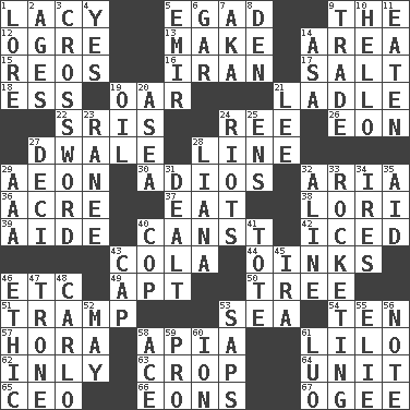 ACROSS 1. Made of lace 5. Mild oath 9. Definite Article 12. Legendary monster 13. Create 14. Length times width 15. Vintage cars 16. SW Asia republic 17. Table seasoning 18. Double-curved letter 19. Rowing implement 21. Dipping utensil 22. Indian titles of respect 24. Portuguese money of account (variant) 26. Period of immesurable duration 27. A sleeping potion; an opiate (poet.) 28. Actor's bit 29. Age 30. Goodbye (Sp.) 32. Roberta Peters solo 36. Land measure 37. Erode 38. Australian parrot (variant) 39. Assistant 40. 2nd pers. sing. pres. of can (arch.) 42. On the rocks 43. Root beer relative 44. Pig sounds 46. And so on (abbr.) 49. Fitting 50. Relationship diagram 51. _____ steamer (cargo ship) 53. Ocean 54. "___ Little Indians" 57. Israeli folk dance 58. Capital of Western Samoa 61. _ and Stitch 62. In an inward manner 63. Riding implement 64. A single undivided whole 65. Corporate head (abbr.) 66. Immeasurably long periods of time 67. Double curve, resembling the letter S DOWN 1. Old wives' tales, e.g. 2. Eras 3. What you're doing now 4. It is so 5. Independent ruler or chieftain 6. Slender fish 7. Alias (abbr.) 8. Lair 9. Buy and sell 10. Phone greeting 11. Consumed 14. White ___ sheet 19. Petroleum 20. At sea 21. Area sheltered from the wind 23. Indian princess (variant) 24. Debaucheries 25. Followers of ems 27. Tenth: prefix 28. Woody, climbing, usually tropical plant 29. American Automobile Association (abbr.) 31. Started a card game 32. Place in a line 33. Shooting up abruptly 34. Angers 35. Help 40. Police officer (slang) 41. Carryall 43. Head covering 45. Retirement account (abbr.) 46. Value system 47. Marketplace scale 48. Monte _, Las Vegas Hotel/Casino 52. Can I? 53. Plant excrements 55. Writer Wiesel 56. Brief written record 58. Adept person 59. Adept person 60. Electrically charged atom 61. Nilotic language