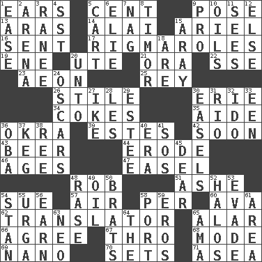 ACROSS 1. Hearing organs 5. Penny 9. Introduce or present, as a question 13. Caspian sea tributary 14. Jai ____ 15. Satellite of Uranus 16. Posted 17. Frustrating wastes of time 19. Compass dir. 20. Shoshoni 21. Mouth or opening 22. Compass dir. 23. Period of immesurable duration 25. Marina Del _, California 26. Vertical member of a panel or frame 30. 4th largest of the Great Lakes 34. Popular sodas 35. Helper 36. Gumbo ingredient 39. _____ Park, CO 42. Within a short period 43. Fermented drink made from hops 44. Eat (away) 46. Grows older 47. Artist's stand 48. Director Reiner 51. American tennis player Robert 54. Institute legal proceedings 57. Atmosphere 58. For each 60. Actress Gardner 62. Interpreter 65. Having or resembling wings 66. Match 67. Through, poetically 68. Method 69. Billionth: prefix 70. Puts into a specified state 71. At sea DOWN 1. Relaxation 2. Sports stadium 3. Indian princess (variant) 4. Fast jet (abbr.) 5. Heavy open wagon 6. Writer Wiesel 7. Tired old horse 8. The easternmost of the Lesser Sundas 9. Adept person 10. Petroleums 11. Perceives with the eye 12. Otherwise 15. Like ___ of sunshine 18. "We ___ not amused" (Victoria) 20. To (old English) 24. Motion picture awards 27. Mamie's husband 28. French article 29. First name in cosmetics 30. Artist's stands 31. River (Sp.) 32. Wedding promise 33. Car or cant ending 36. Chief or king in Benin or Nigeria 37. Barrel 38. To sift 40. Epoch 41. Distress signal 45. Letter starter 48. To erase 49. Lubricate 50. Naughty children 52. Saint headwear 53. Elude 54. Comedian Laurel of Laurel & Hardy 55. Capital and largest city of Mongolia 56. Merit 58. Left side of a ship or aircraft 59. Greek god of love 61. Length times width 63. Modern: prefix 64. Definite Article 65. Nanny (var.)