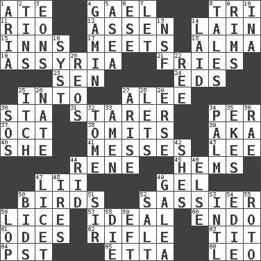 ACROSS 1. Had dinner 4. Highlander 8. Three (prefix) 11. River (Sp.) 12. NE Netherlands city 14. (Had) reclined 15. Taverns 17. Confronts 18. _ mater 19. Nineveh was its capital 21. Strips of potato fried in deep fat 23. Elected rep. 24. Begley and Asner 25. To the inside or interior of 27. Toward shelter 30. R.R. building 31. A viewer who gazes fixedly 34. For each 37. Sep. follower 38. Leaves out 39. Alias (abbr.) 40. A female animal or person 41. Makes clutter 43. Area sheltered from the wind 44. French philosopher Descartes 45. Folds over and sews together 47. Cards in a Roman deck? 49. Set 50. Avian creatures 52. More disrespectful 56. Louse (plural) 57. Standard of perfection 60. Inside; within (prefix) 61. Lyric poems 62. Firearm 63. Teat (slang) 64. Pacific Standard Time (abbr.) 65. Singer James 66. Lion DOWN 1. Operatic vocal solo 2. Canisters 3. Immeasurably long periods of time 4. Street urchin 5. At sea 6. Compass dir. 7. Allow 8. Lies 9. Basketball hoops 10. _ tizzy (2 wds.) 13. Science/research agcy. 14. Put down 16. System (abbr.) 20. Vintage cars 22. Portuguese money of account (variant) 25. Hankering 26. Nathan's nickname 27. Get up 28. Allows 29. Celtic language 30. Mayday 32. Heavy book 33. So be it 34. Inside of hand 35. Supplements with great effort 36. Actress Charlotte 42. "______ My Girl" (Turtles hit) 44. To free from 46. Otherwise 47. It is permitted: Lat. 48. Angers 49. An organ shaped like a helmet 50. Auction offers 51. Title for a knight 52. Table seasoning 53. International (abbr.) 54. Singer Brickell 55. Printing process, for short 56. Chop off 58. Pass on 59. Bank Draft (abbr.)
