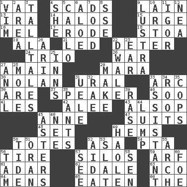 ACROSS 1. Large container 4. Tons 9. (Had) reclined 13. Retirement account (abbr.) 14. Radiant circles of light 15. Goad 16. Cartoonist voice _ Blanc 17. Eat (away) 18. Portico 19. According to 21. Directed 22. Prevent from occurring 24. Musical group of three 26. Armed conflict 27. With great haste 29. Hindu Mythology: god of death 30. Pitcher Ryan 31. Mountain range 33. Curve 36. "We ___ not amused" (Victoria) 37. Orator 40. "Barney Miller" actor Jack 41. French article 42. Toward shelter 43. Columnist Joseph or Stewart 45. Singer Murray 47. Sets or collections 48. Put into a specified state 49. Equivocates 50. Hauls 52. White ___ sheet 54. Parent Teacher Assoc. 56. Hoop that covers a wheel 57. Grain storage towers 59. Sandy's bark 61. The sixth month of the Jewish calendar 62. Peak District village in England 63. Non-commissioned officer (abbr.) 64. Not women's 65. Eroded 66. Definite Article DOWN 1. Zeal 2. Length times width 3. Baron Munchausen's specialties 4. A female animal or person 5. Monte _, Las Vegas Hotel/Casino 6. Medicinal plant 7. Texas town _ City 8. Compass dir. 9. A period of five years 10. Johnson of "Laugh-In" 11. Composer Stravinsky 12. Teachers' org. 20. Roberta Peters solo 22. A sleeping potion; an opiate (poet.) 23. Hearing organ 25. Restaurants 27. Of or related to the anus 28. Greater amount 29. Cause to be 31. Ubangi River tributary 32. Actress Charlotte 33. Aide 34. Carrot, for example 35. 911 reaches them 38. Leg coverings 39. Raze (variant) 44. Mass 45. Michaelmas daisies 46. Born 49. White Person, in Hawaii 50. Event that recurs at intervals 51. NW Algerian seaport 52. Opera by Verdi 53. Narrow board 55. Bowlike part 56. Scottish cap 57. Observe 58. Elected rep. 60. Enemy