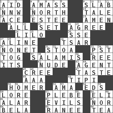 ACROSS 1. Help 4. Collect or gather 9. Thick slice 13. Compass dir. 14. _ pole 15. Lie 16. Adept person 17. First name in cosmetics 18. So be it 19. 100% 21. Arrange properly for use 22. Match 24. _ and Stitch 26. Compass dir. 27. Place in a line 29. Russian ruler of old 30. Music written for nine 31. Portico 33. Pacific Standard Time (abbr.) 36. Coat; cloak 37. Deli grouping 40. To sift 41. It is 42. Unadorned 43. Rep 45. Algonquian 47. Clothes sense 48. Auto club (abbr.) 49. Native american tent (variation) 50. Home run 52. Wet nurse (var.) 54. Begley and Asner 56. Old wives' tales, e.g. 57. Military trainee 59. Biblical high priest 61. Having or resembling wings 62. Vices 63. Not either 64. Actor Lugosi 65. Indian princess (variant) 66. Beverage made from leaves DOWN 1. Santa ___, CA 2. South American Indian 3. Residences 4. One (Scot) 5. With motion or animation 6. Johnson of "Laugh-In" 7. Proofreading order 8. A female animal or person 9. A viewer who gazes fixedly 10. Unable to walk 11. Toward shelter 12. Benjamin's nick name 20. Actor's bit 22. Slender Brazilian palm 23. Girls' org. (abbr.) 25. Allows 27. Against 28. Spoils 29. Heavy book 31. Turn sharply 32. Small amount or degree 33. Elected leader of a country 34. Emitted 35. Wig 38. Approach 39. Suttee (variant) 44. Stare wonderingly 45. Device for capturing images 46. Actress Charlotte 49. Eating place 50. Hollow 51. Taken by mouth 52. Inventor's middle name 53. Chow _ 55. _ gin 56. Experiment locale 57. For each 58. Compass dir. 60. Retirement account (abbr.)