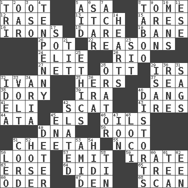 ACROSS 1. A blast of a horn 5. White ___ sheet 8. Heavy book 12. Raze (variant) 13. Hankering 15. Ancient Greek god of war 16. Removes the wrinkles 18. Have the gumption 19. Object of repulsion 20. Cooking vessel 22. Thinks logically 24. Writer Wiesel 26. _ de Janeiro 27. Remaining after all deductions 28. Baseball player Mel 29. Big collection agency 32. _ the terrible 35. Possessive pronoun 37. Ocean 38. Rowboat 39. Retirement account (abbr.) 40. Mild oath, euphamism for damn 41. Biblical high priest 42. Jazz singing style 43. Angers 44. "One Day ___ Time" 45. Raised railways 46. Petroleums 49. Heredity factor (abbr.) 50. Carrot, for example 51. Leopard's kin 55. Non-commissioned officer (abbr.) 56. Spoils 57. Give off 59. Feeling or showing extreme anger 63. Celtic language 64. "You Light Up My Life" star Conn 65. Relationship diagram 66. River in Europe 67. Lair 68. Skim DOWN 1. Three (prefix) 2. Rowing implement 3. Bear (Spanish) 4. 3-inch nail 5. Assist 6. Play the lead 7. Land measure 8. Off limits 9. Northwest Algerian city 10. Not women's 11. Compass dir. 14. Centers of feelings and intuitions 17. Not divided or shared with others 21. Teat (slang) 23. Be seated 25. Moral principles 28. Speaker 29. Austrian river, tributary to the Danube 30. French philosopher Descartes 31. Settles 32. The content of cognition 33. Electrical Unit 34. Roberta Peters solo 36. Period 40. What propaganda does 42. Scheduled 45. Compass dir. 47. Electrically charged atom 48. Event scenes 49. Prevent from occurring 51. Drawstring 52. Stockings 53. Among 54. Flintstone garb 56. Lion 58. Shallow baking pan 60. Curve 61. Afternoon social gathering 62. Car or cant ending
