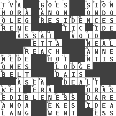 ACROSS 1. Federal power corp. 4. Travels 8. The Jewish people; Israel 12. Israeli folk dance 14. At once, immediately (arch.) 15. Southwest Nigerian state 16. Cassini of fashion 17. Dwellings 20. French philosopher Descartes 21. Nervous spasm 22. Binary compound 23. Slender Brazilian palm 27. Nothingness 29. Singer James 31. Be tempered by heat 34. Arrive at 35. Singer Murray 36. Ancient Persian 39. Being at a high temperature 41. Nuclear Threat Initiatives 42. Singles 43. Cabin 46. Waist strap 47. Raised platform 48. Toward the sea 51. Started a card game 54. Dripping 56. Period 58. Mouths or openings 61. The property of being fit to eat 66. Have the gumption 67. Small Philippine buffalo 68. Makes supply last 69. The content of cognition 70. Long (Scottish) 71. Gone 72. Double-curved letter DOWN 1. Son of Odin 2. Short-tailed, large-bodied rat 3. Sports stadium 4. Slender fish 5. Single 6. Greek goddess of the dawn 7. In a ____ (agitated or irritated) 8. Male child 9. Happening 10. Wrote a lyric poem 11. Sense of smell 13. Eons 18. HTML Container Element 19. Environmental prefix 24. Perceive with the eye 25. "One Day ___ Time" 26. Hankering 28. Empty; void 30. Hold, grip (Informal) 32. Black tropical American cuckoo 33. French article 34. Musical pauses 36. Disorderly crowd 37. Compass dir. 38. Accusation by an informer 40. Frog relative 44. Pass on 45. Girls' org. (abbr.) 49. Snakelike fish 50. "We ___ not amused" (Victoria) 52. Farming town in central California 53. Exchange 54. Welt 55. Pulitzer Prize-winning author Ferber 57. Afresh 59. Ancient Greek god of war 60. Oceans 62. Paper or plastic container 63. Supplement with great effort 64. Elected rep. 65. Fast jet (abbr.)