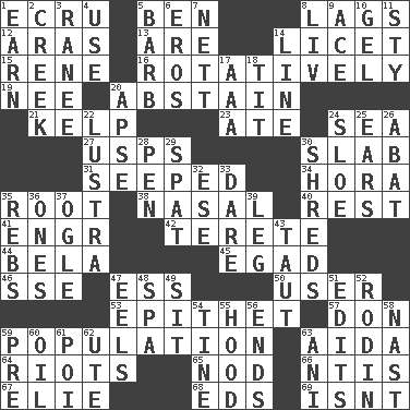 ACROSS 1. Shade of tan 5. Benjamin's nick name 8. Fails to keep up a pace 12. Ancient river in northeast Turkey 13. "We ___ not amused" (Victoria) 14. It is permitted: Lat. 15. French philosopher Descartes 16. Producing rotation 19. Born 20. Choose not to consume 21. Seaweed 23. Had dinner 24. Ocean 27. United States Postal Service (abbr.) 30. Thick slice 31. Oozed 34. Israeli folk dance 35. Carrot, for example 38. Relating to the nose 40. Repose 41. Engineer (abbr.) 42. Cigar-shaped 44. Actor Lugosi 45. Mild oath 46. Compass dir. 47. Double-curved letter 50. One who makes use of a thing 53. Curse 57. Spanish title 59. Census information 63. Opera by Verdi 64. Disturbances 65. Allow head to fall sleepily 66. Nuclear Threat Initiatives 67. Writer Wiesel 68. Begley and Asner 69. Is not DOWN 1. Merit 2. Small stream 3. Indian princess (variant) 4. Purpose 5. Sharp remark 6. Greek god of love 7. Remaining after all deductions 8. 54 in ancient Rome 9. Adept person 10. Set 11. Filthy place 14. Actor's bit 17. Auto club (abbr.) 18. Teat (slang) 20. Domed church section 22. A period of five years 24. _ gin 25. Hearing organs 26. Blind as ____ 28. Animal enclosure 29. Petty quarrel 30. Tears up 32. Compass dir. 33. Have the gumption 35. Confederate soldiers (slang) 36. Singles 37. Stare at amorously 39. Part of a journey 43. Drawn tight 47. Snakelike fish 48. Health resort 49. Be seated 51. Prepares for publication 52. "The Thinker" sculptor 54. Prong on a fork 55. Parka part 56. Extremities 58. Political cartoonist Thomas 59. Before (prefix) 60. Petroleum 61. Luau course 62. Shoshoni 63. Cuckoo