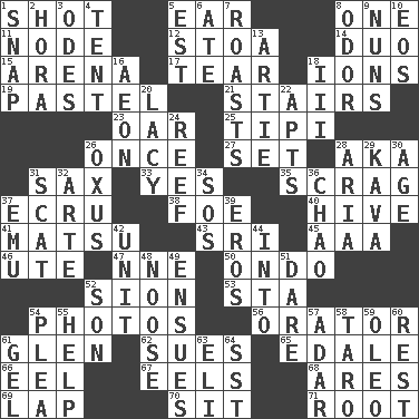 ACROSS 1. Opportunity 5. Ewer handle 8. Single 11. Connecting point 12. Portico 14. Superhero pair 15. Sports stadium 17. Pull into pieces 18. Charged particles 19. Soft color 21. Flight of steps 23. Rowing implement 25. Native american tent (variation) 26. At one time in the past 27. Put into a specified state 28. Alias (abbr.) 31. Saxophone 33. It is so 35. Lean end of the neck 37. Shade of tan 38. Enemy 40. Hub of activity 41. Taiwanese island in East China Sea 43. _ Lanka 45. American Automobile Association (abbr.) 46. Shoshoni 47. Compass dir. 50. Southwest Nigerian state 52. The Jewish people; Israel 53. R.R. building 54. Pictures 56. Speaker 61. Small, secluded valley 62. Takes to court 65. Peak District village in England 66. Snakelike fish 67. Snakelike fish 68. Ancient Greek god of war 69. Infant locale 70. Be seated 71. Carrot, for example DOWN 1. Fastener 2. Israeli folk dance 3. Lyric poems 4. Portable shelter 5. Eastern Standard Time (abbr.) 6. Had dinner 7. Ridicules or criticizes harshly 8. Aroma 9. Religious women 10. Greek goddess of the dawn 13. Nick name for Arthur 16. Period of immesurable duration 18. One more than two 20. Made of lace 22. Tenement units (abbr.) 24. Coral collection 26. The longest river in Central Asia 28. Roberta Peters solo 29. Polynesian shrub of the pepper family 30. Personal question 31. Get outta here! 32. Johnson of "Laugh-In" 34. Distress signal 36. US Secretary of Labor Elaine L. _ 37. Australian flightless bird 39. Greek god of love 42. A single undivided whole 44. To the inside or interior of 48. Trap for birds or small mammals 49. Follows as a consequence or result 51. Have the gumption 52. Male offspring 54. Entreaty 55. Aid 57. The sixth month of the Jewish calendar 58. Pacific island yam 59. Margarine 60. Remainder 61. Set 63. Connecticut Ivy Leaguer 64. Fast jet (abbr.)