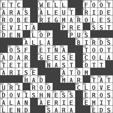 ACROSS 1. And so on (abbr.) 4. Water source 8. One third of a yard 12. Ancient river in northeast Turkey 14. Eskimo relative 16. Travel on an animal 17. Loose flowing garment 18. Frustrating wastes of time 20. Webber/Rice musical 22. Before (prefix) 23. Fast jet (abbr.) 24. Lair 25. Chop off 28. Festering 30. Silent film actress Nazimova 31. Avian creatures 35. Order of Saint Francis (abbr.) 37. Inactive volcano in Sicily 40. A blast of a horn 41. The sixth month of the Jewish calendar 42. Honkers 44. Root beer relative 45. False hair 46. Political cartoonist Thomas 47. Baseball player Mel 48. Originate 50. Tiny particle 52. Possessed 54. Third mo. 55. Make lace 58. RI univ. 61. Friend of Pooh 63. Garlic unit 65. Innocence, gentleness, or tenderness 70. Greek god of love 71. Actor Alda or Thicke 72. Nest on high 73. Give off 74. Grant temporary use of 75. "Two Mules for Sister ____" 76. Begley and Asner DOWN 1. Having ears or earlike features 2. Collection of objects 3. Apartment or room in a ship 4. Armed conflict 5. Biblical high priest 6. Part of a journey 7. Mass 8. From 9. Petroleums 10. Lyric poems 11. Trial 13. Arrange properly for use 15. Canvas cover 19. Reuben's nickname 21. 100% 26. Cassini of fashion 27. Eucharist need 29. "Cheers" or "Ellen" 30. Anew 32. Carrot, for example 33. Stupid person 34. R.R. building 35. River in Europe 36. Suttee (variant) 38. Teachers' org. 39. Indian state 41. _ moment's notice (2 wds.) 43. Singer James 49. Hearing organs 51. The grampus (Milton) 53. Capital of the state of Qatar 55. Singer Mel 56. Stay clear from 57. Trials 58. Hereditary estate 59. Hero or heavy, e.g. 60. _ the terrible 62. Washington bills 64. Area sheltered from the wind 66. Working for oneself (abbr.) 67. Epoch 68. Title for a knight 69. Ocean