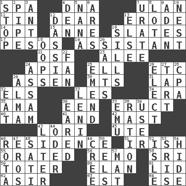 ACROSS 1. Health resort 4. Heredity factor (abbr.) 7. ____ Bator, Mongolia 11. Shallow baking pan 12. Letter starter 13. Wear away 14. Choose 15. Queen of England 1702-14 16. Chalkboards 17. Mexican monetary units 19. Aide 21. Order of Saint Francis (abbr.) 23. Toward shelter 24. Capital of Western Samoa 25. Pipe bend 26. And so on (abbr.) 29. NE Netherlands city 30. Mountains (abbr.) 31. Pet locale 32. Raised railways 33. French article 34. Epoch 35. Nanny (var.) 36. Car or cant ending 37. Spew [out] 40. Scottish cap 41. Also 42. Vertical spar for supporting sails 43. Australian parrot (variant) 45. Shoshoni 46. Home 51. From or relating to Ireland 55. Spoke pompously 56. San ____ (Riviera town) 58. Indian title of respect (Mr.) 59. Carrier 60. Style 61. Flaplike covering 62. SW Saudi Arabia district 63. Eastern Standard Time (abbr.) 64. Compass dir. DOWN 1. Cease 2. Corncob 3. Pismires 4. Lair 5. Nanny 6. Ancient Greek god of war 7. A salt of uric acid 8. Globular water bottle used in Asia 9. Arabian gulf 10. Egg locale 12. Hyrax 13. Otherwise 16. Beverly of Met fame 18. I made a mistake 20. Table seasonings 22. Air blower 24. Indian state 25. Make improvements or corrections to 26. Choose 27. Small pie 28. Tax preparer (abbr.) 29. _ mater 32. Ingest 33. Soviet premier 1918-24 36. Having ears or earlike features 37. Australian flightless bird 38. Food allowance for one day 39. One who makes use of a thing 43. 61 cubic inches 44. Baltic tributary 46. Roll call or roster of names 47. Greek god of love 48. Suttee (variant) 49. Algonquian 50. Snakelike fish 52. Small island 53. Indian titles of respect 54. Flintstone garb 57. Floor covering