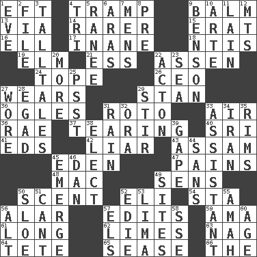 ACROSS 1. Lizard (obsolete) 4. _____ steamer (cargo ship) 9. Lip ointment 13. By way of 14. More uncommon 15. Part of Q.E.F. 16. Pipe bend 17. Lacking in sense or substance 18. Nuclear Threat Initiatives 19. Shade tree 21. Curvy letter 22. NE Netherlands city 24. Drink excessively 26. Corporate head (abbr.) 27. Puts on (as clothing) 29. Comedian Laurel of Laurel & Hardy 30. Stares at amorously 31. Printing process, for short 33. Atmosphere 36. Actress Charlotte 37. Separating forcefully 40. _ Lanka 41. Begley and Asner 42. One who doesn't tell the truth 43. Indian state 45. Locale of original sin 47. Aches 48. Apple computer (short form) 49. Elected reps. 50. Aroma 52. Connecticut Ivy Leaguer 54. R.R. building 56. Having or resembling wings 57. Proofreads 59. Nanny (var.) 61. Protracted 62. Citrus fruits 63. Tired old horse 64. False hair 65. Gospel singer Marvin 66. Definite Article DOWN 1. First lady 2. Do some clerical work 3. Baron Munchausen's specialties 4. Three (prefix) 5. Indian princess (variant) 6. Ancient river in northeast Turkey 7. Not women's 8. Before (prefix) 9. Gillaume's butler role 10. Johnson of "Laugh-In" 11. (Had) reclined 12. Mountains (abbr.) 20. Greater amount 22. NE Massachussets city 23. Ocean 25. Inconspicuous attention getter 27. Had on 28. Mild oath 29. Disorderly outburst 31. Water falling in drops from the sky 32. Mouth or opening 33. Aide 34. SW Asia republic 35. Basketball hoops 38. Choose 39. Stare wonderingly 44. Without 45. Develop 46. One of the 12 tribes of Israel 49. Settings 50. A type of plum 51. Patter 52. Singer Brickell 53. Pale green bean 55. Nanny 56. Keyboard modifier key 57. Raised railways 58. Compass dir. 60. Grow older
