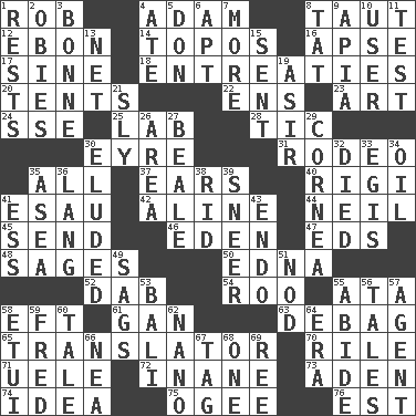 ACROSS 1. Director Reiner 4. First man 8. Pulled tight 12. Inky black, to poets 14. Traditional theme or motif 16. Domed church section 17. Trig term 18. Pleas 20. Portable shelters 22. Followers of ems 23. Nonscientific branch of learning 24. Compass dir. 25. Experiment locale 28. Nervous spasm 30. Jane of fiction 31. Cowboy competition 35. Everything 37. Hearing organs 40. Swiss mountan, "Queen of the Mountains" 41. He sold his birthright 42. Place in a line 44. Famous astronaut Armstrong 45. Transmit 46. Paradise 47. Begley and Asner 48. Gurus 50. Pulitzer Prize-winning author Ferber 52. Small moist lump or mass 54. Friend of Pooh 55. "One Day ___ Time" 58. Newt 61. Separate the seeds from cotton 63. Debunk (Brit. slang) 65. Interpreter 70. Cause heat under the collar 71. Ubangi River tributary 72. Lacking in sense or substance 73. Arabian gulf 74. It may be bright or harebrained 75. Double curve, resembling the letter S 76. Eastern Standard Time (abbr.) DOWN 1. Musical pauses 2. Off-Broadway awards 3. Child's nurse 4. Had dinner 5. Spanish title 6. Fitting 7. Greater amount 8. Make lace 9. Capital of Western Samoa 10. One who uses or employs something 11. Trial 13. Fish or hair follower 15. Transmitted 19. SW Saudi Arabia district 21. Mischievous 26. Type of rug 27. Calif. Air Force Base 29. Pupil covering 30. Evaded 32. Passed on 33. The front part of a cuirass 34. Lubricate 35. Toward the sea 36. Long (Scottish) 38. To free from 39. Contemptuous expression 41. Curvy letter 43. Inside; within (prefix) 49. Droops 51. Lower and raise head in agreement 53. Indonesian resort city 55. Remain 56. Lies 57. Rep 58. Needle case 59. Flintstone 60. Story 62. Billionth: prefix 64. Period 66. Teachers' org. 67. Label 68. Single 69. To sift