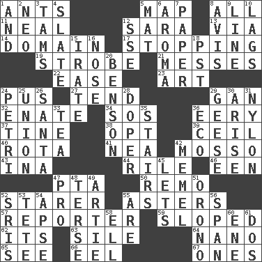 ACROSS 1. Pismires 5. Atlas unit 8. Everything 11. Anneal 12. "Two Mules for Sister ____" 13. By way of 14. Kingdom 17. Ceasing 19. Disco prop 21. Makes clutter 22. Comfort 23. Tate display 24. Purulenc 27. Watch over 29. Separate the seeds from cotton 32. Related on the mother's side 34. Distress signal 36. Suggestive of the supernatural 37. Prong on a fork 38. Elect 39. To provide with a ceiling 40. Roll call or roster of names 41. Teachers' org. 42. With motion or animation 43. _ tizzy (2 wds.) 44. Cause heat under the collar 46. Car or cant ending 47. Parent Teacher Assoc. 50. San ____ (Riviera town) 52. A viewer who gazes fixedly 55. Michaelmas daisies 57. News announcer 59. Inclined 62. ___ a Wonderful Life 63. Filth; sediment 64. Billionth: prefix 65. Observe 66. Snakelike fish 67. Washington bills DOWN 1. Plus 2. Modern: prefix 3. Scottish caps 4. Schedule 5. Floor protector 6. Scent 7. Some stationery 8. Opinion 9. Actor's bit 10. Straggles 12. Compass dir. 15. Feeling or showing extreme anger 16. Sense of smell 18. Pacific Standard Time (abbr.) 20. Gillaume's butler role 24. _ dish (used to culture cells) 25. The state of being joined or united 26. Before Barbara or Clara 28. Drug addict 29. Honkers 30. Originate 31. High-strength synthetic material 33. Beverage made from leaves 35. Flight of steps 36. Environmental prefix 42. Klaipeda city 45. Allows 47. Adept person 48. Laconic 49. Nick name for Arthur 51. U. of Maine site 52. Indian titles of respect 53. False hair 54. Domed church section 55. "We ___ not amused" (Victoria) 56. Connect, as a bridge 58. Pipe bend 60. Compass dir. 61. Two (Sp.)