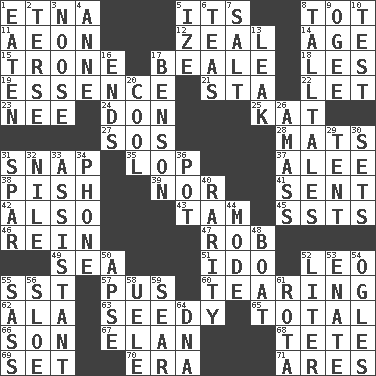 ACROSS 1. Inactive volcano in Sicily 5. It is 8. Small child 11. A really long time 12. Ardor 14. Personal question 15. Heavy duty weighing machine 17. Memphis, Tenn. Street 18. French article 19. Gist 21. R.R. building 22. Allow 23. Born 24. Spanish title 25. Krazy ___ of comics 27. Distress signal 28. Floor protectors 31. Fastener 35. Trim (branches) 37. Toward shelter 38. Expression of disdain 39. And not 41. Posted 42. In addition 43. Scottish cap 45. Fast planes 46. It's straight from the horse's mouth 47. Director Reiner 49. Ocean 51. Wedding promise 52. Lion 55. Fast jet (abbr.) 57. Purulenc 60. Pulling into pieces 62. Chicken ___ king 63. Sleazy 65. "_____ Recall" 66. Boy, to dad 67. Style 68. False hair 69. Put into a specified state 70. Period 71. Ancient Greek god of war DOWN 1. Eroded 2. Laconic 3. Trap for birds or small mammals 4. Singer Murray 5. Ending with capital 6. Beverages made from leaves 7. Table seasoning 8. Baron Munchausen's specialties 9. Double curve, resembling the letter S 10. Trial 13. Path through which fluid escapes 16. Extremities 17. Gillaume's butler role 20. Calm and collected 26. Collect or gather 29. Portable shelter 30. Arranges properly for use 31. Coast Guard woman 32. The longest river in the world 33. Helper 34. Give a jingle 36. Plant holder 40. Noteworthy scarcity 44. Method 48. Water vessel 50. Domed church section 52. 61 cubic inches 53. Related on the mother's side 54. Stares at amorously 55. Backtalk 56. A type of plum 58. Ubangi River tributary 59. Dry up 61. Round or rotation of duties 64. Heredity factor (abbr.)