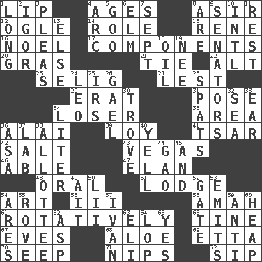 ACROSS 1. Mouth edge 4. Matures 8. SW Saudi Arabia district 12. Stare 14. Hero or heavy, e.g. 15. French philosopher Descartes 16. Christmas carol 17. Pieces 20. Pate de foie ____ 21. Neckwear 22. The first octave above the treble staff 23. Major League Baseball Commissioner Bud 27. For fear that 29. Part of Q.E.F. 31. Airs 34. Failure 35. Type of rug 36. Mountain range southwest of Kyrgyzstan 39. Myrna of the movies 41. Russian ruler of old 42. Table seasoning 43. Viva Las _ 46. Competent 47. Flair 48. Taken by mouth 51. Inn 54. Nonscientific branch of learning 56. One more than two 58. Nanny 61. Happening in regular succession 66. Prong on a fork 67. Nights before holidays 68. Medicinal plant 69. Singer James 70. Ooze 71. Cuts off 72. Small drink DOWN 1. Yearn 2. Russian composer Stravinsky 3. Entreaties 4. Curve 5. Thick or sticky substance 6. Shade tree 7. Back-to-school mo. 8. "We ___ not amused" (Victoria) 9. Elected representatives 10. International (abbr.) 11. Take ten 13. Otherwise 18. Lubricate 19. Born 24. Lion 25. Big collection agency 26. Highlander 28. Arguments over trivial matters 30. Collection of objects 32. Ocean 33. Ewer handle 34. 61 cubic inches 36. White ___ sheet 37. Experiment locale 38. One to whom something is allotted 40. Shout 44. E Mali city 45. Plus 49. Small island 50. Cards in a Roman deck? 52. Yard entry 53. Sends forth 54. Ancient Greek god of war 55. Be footloose 57. _ the terrible 59. Against 60. Pile 62. Cleo's killer 63. Biblical high priest 64. Trim (branches) 65. It is so