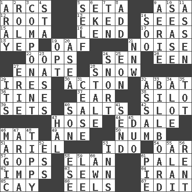 ACROSS 1. Arches 5. Stalk of a moss capsule 9. White ___ sheet 12. Carrot, for example 13. Made supply last 14. Perceives with the eye 15. _ mater 16. Grant temporary use of 17. Mouths or openings 18. Slangy assent 19. Clumsy lout 21. Annoying sound 22. I made a mistake 24. Elected rep. 26. Car or cant ending 27. Related on the mother's side 28. Overwhelm 29. Angers 30. 13-14th century defensive garment 32. Blind as ____ 36. Prong on a fork 37. Hearing organ 38. Grain storage tower 39. Arranges properly for use 40. Table seasonings 42. Slit 43. Stockings 44. Peak District village in England 46. Floor covering 49. A saturated hydrocarbon 50. Unfeeling 51. Satellite of Uranus 53. Wedding promise 54. Rowing implement 57. Republicans 58. Liveliness 61. Light colored 62. Naughty children 63. Stitched 64. SW Asia republic 65. Island 66. Snakelike fish 67. Prepare for publication DOWN 1. Like ___ of sunshine 2. Hero or heavy, e.g. 3. Piece 4. R.R. building 5. Itself 6. Supplement with great effort 7. Nine, plus one 8. Say or write further 9. Nest on high 10. Gospel singer Marvin 11. NE Netherlands city 14. "Barney Miller" actor Jack 19. Choose 20. At sea 21. Compass dir. 23. Fertile tracts in a desert 24. Derisive sound 25. Age 27. One of the Great Lakes 28. Showing deterioration from age 29. It is 31. Desist 32. Indian state 33. Big road sign 34. _ vera 35. Small child 40. Male child 41. Post 43. Actor Linden 45. Superhero pair 46. Mysterious quality of enchantment 47. Scent 48. Likely to tip or tilt 52. Double-curved letter 53. Restaurants 55. Jai ____ 56. Monthly bill 58. Compass dir. 59. Area sheltered from the wind 60. Leather borer 61. Sliced dessert