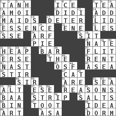 ACROSS 1. Hyperbolic tangent 5. Frozen water 8. Beverage made from leaves 11. Mine, in Marseilles 12. "You Light Up My Life" star Conn 14. Say or write further 15. Unmarried girls 17. Prevent from occurring 18. Flaplike covering 19. Substance 21. Compass dir. 22. French article 23. Compass dir. 24. Sandy's bark 25. Be seated 27. Sliced dessert 28. Nathan's nickname 31. Pile 35. Long, evenly shaped piece 37. Secret move to avoid paying debts 38. Celtic language 39. Definite Article 41. Monthly bill 42. Political cartoonist Thomas 43. Order of Saint Francis (abbr.) 45. Toward the sea 46. Agitate 47. Feline 49. Title for a knight 51. "We ___ not amused" (Victoria) 52. Ocean 55. The first octave above the treble staff 57. Compass dir. 60. Thinks logically 62. Sound made by sheep 63. Empty completely 65. Table seasonings 66. Storage container 67. A blast of a horn 68. It may be bright or harebrained 69. Nonscientific branch of learning 70. White ___ sheet 71. Dormintory (informal) DOWN 1. Corrects by punishment or discipline 2. Collect or gather 3. Annoying sound 4. Flintstone garb 5. Binary compound 6. Quote 7. Genesis locale 8. Baron Munchausen's specialties 9. Singer Brickell 10. Sums up 13. Angers 16. Fastener 17. Outscore 20. Baby bed with high sides 26. Kind of red light 29. Prong on a fork 30. Singer James 31. Coop moms 32. Part of Q.E.F. 33. Aide 34. _ dish (used to culture cells) 36. 17th letter of the Greek alphabet 40. Fortification 44. Conductor's collection 48. Afternoon social gatherings 50. Take ten 52. Twentieth part of a lira 53. Keyboard key 54. Indian state 55. Swedish rock group 56. Den 58. Portico 59. Greek god of love 61. Alleged 64. Call ___ day