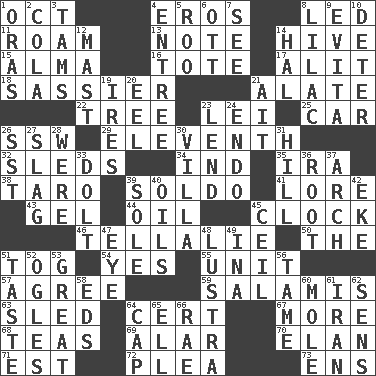 ACROSS 1. Sep. follower 4. Greek god of love 8. Directed 11. Wander aimlessly 13. Brief written record 14. Hub of activity 15. _ mater 16. Lug 17. Set down 18. More lively and spirited 21. Having winglike extensions 22. Family _ (genealogy) 23. Luau accessory 25. Auto 26. Compass dir. 29. Veterans Day date 32. Bobsleighs 34. Working for oneself (abbr.) 35. Retirement account (abbr.) 38. Edible starchy tuberous root 39. Twentieth part of a lira 41. Old wives' tales, e.g. 43. Set 44. Petroleum 45. Timepiece 46. Copy Pinocchio 50. Definite Article 51. Coat; cloak 54. It is so 55. A single undivided whole 57. Match 59. Deli grouping 63. Downhill vehicle 64. Foregone conclusion 67. Greater amount 68. Afternoon social gatherings 69. Having or resembling wings 70. Flair 71. Eastern Standard Time (abbr.) 72. Entreaty 73. Followers of ems DOWN 1. Mouths or openings 2. Root beer relative 3. Scottish caps 4. Main course 5. Friend of Pooh 6. Baseball player Mel 7. Perceive with the eye 8. Pale purple color 9. Webber/Rice musical 10. Prevent from occurring 12. Vertical spar for supporting sails 14. Actor Linden 19. Angers 20. Snakelike fish 21. Small island 23. Grant temporary use of 24. Inside; within (prefix) 26. Fast jet (abbr.) 27. Volcanic refuse 28. Past tense of be (plural) 30. Country estate 31. Land elevation 33. Dunce 36. Carrot, for example 37. Bowlike part 39. Flatfish 40. Petroleums 42. Make supply last 45. To provide with a ceiling 47. Sight organ 48. A period of five years 49. _ tizzy (2 wds.) 51. Clothes sense 52. Stares at amorously 53. Relatively large 56. Not wild 58. Begley and Asner 60. Undercover agent 61. SW Asia republic 62. Elected reps. 64. Head covering 65. Pipe bend 66. Actress Charlotte