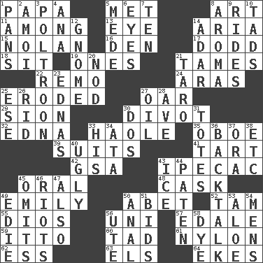 ACROSS 1. Dad 5. Was introduced to 8. Tate display 11. Amid 13. Sight organ 14. Roberta Peters solo 15. Pitcher Ryan 16. Lair 17. Texas town _ City 18. Be seated 19. Singles 21. Makes less strong or intense 22. San ____ (Riviera town) 24. Ancient river in northeast Turkey 25. Eaten away 27. Rowing implement 29. The Jewish people; Israel 30. A piece of turf (Scot.) 32. Pulitzer Prize-winning author Ferber 33. White Person, in Hawaii 35. Mitch Miller's instrument 39. Sets of matching outer garments 41. Small pie 42. Girls' org. (abbr.) 43. Medicinal drug used to evoke vomiting 45. Spoken 48. Keg 49. Poet Dickinson 50. Collude with 52. Scottish cap 55. "Vaya con ____" 56. Corn or form start 57. Peak District village in England 59. "Tell ____ the Marines!" 60. Small amount or degree 61. High-strength synthetic material 62. Double-curved letter 63. Raised railways 64. Supplements with great effort DOWN 1. Baking dishes 2. Mine, in Marseilles 3. Characterized by complete cowardliness 4. Santa ___, CA 5. Ancient Persian 6. Sight organs 7. "___ Little Indians" 8. Odor 9. Amusement-park features 10. Small amounts or degrees 12. Dwarf 14. The sixth month of the Jewish calendar 20. Allow head to fall sleepily 21. Edible starchy tuberous root 23. Ferber et al. 25. Compass dir. 26. To free from 27. Petroleum 28. "___ Maria" 30. Two (Sp.) 31. Lugs 33. Part of HMS, perhaps 34. "One Day ___ Time" 36. Sass 37. Mouth or opening 38. And so on (abbr.) 40. Repulsive 43. Frozen water 44. Eucharist need 45. Leaves out 46. Debaucheries 47. In addition 49. Singer Brickell 50. Of or related to the anus 51. Auction offers 53. Medicinal plant 54. Not women's 56. Shoshoni 58. Color