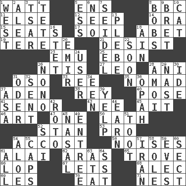 ACROSS 1. Electrical Unit 5. Followers of ems 8. English channel? 11. Otherwise 12. Ooze 14. Mouth or opening 15. Theater features 17. Earth 18. Collude with 19. Cylindrical with tapered ends 21. Cease 23. Australian flightless bird 25. Inky black, to poets 26. Nuclear Threat Initiatives 27. Lion 28. Cuckoo 31. Bear (Spanish) 33. To riddle 35. Wanderer 37. Arabian gulf 38. Marina Del _, California 40. Airs 41. Sir (Sp.) 43. Born 45. Small island 46. Nonscientific branch of learning 47. Single 50. Thin strip of wood or metal 52. Comedian Laurel of Laurel & Hardy 53. Adept person 54. Buttonhole 56. Annoying sounds 61. Jai _ 62. Ancient river in northeast Turkey 65. Collection of objects 66. Trim (branches) 67. Allows 68. Actor Baldwin 69. French article 70. Ingest 71. Egg locale DOWN 1. Compass direction 2. Toward shelter 3. Russian ruler of old 4. Wig 5. Double-curved letter 6. Modern: prefix 7. Beer mug 8. Moves up and down 9. Cy Young winner Saberhagen 10. Feline 13. Cadet 16. Proofreading order 18. The 18th letter of the Arabic alphabet 20. Arab leader 22. Within a short period 24. One who uses or employs something 26. Words to Nanette 28. Mine, in Marseilles 29. Political cartoonist Thomas 30. Binary compound 31. River in Europe 32. Transmitted 34. Car or cant ending 36. Brightly colored fish 37. White ___ sheet 39. Sharp bark 42. Printing process, for short 44. Merit 48. Rhinal 49. Main course 51. A blast of a horn 52. _-fi 54. Medicinal plant 55. Smile enhancers 57. SW Asia republic 58. Flatfish 59. Nights before holidays 60. Religious group 61. 100% 63. "One Day ___ Time" 64. Fast jet (abbr.)
