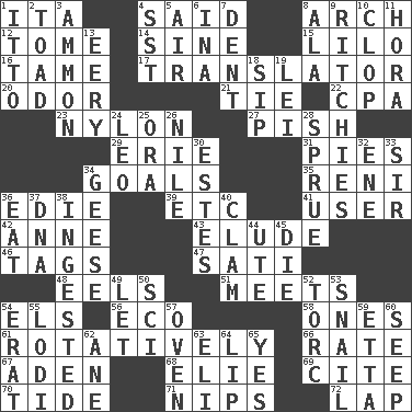 ACROSS 1. Call ___ day 4. Alleged 8. Bowlike part 12. Heavy book 14. Trig term 15. _ and Stitch 16. Not wild 17. Interpreter 20. Scent 21. Standoff 22. Accounting whiz (abbr.) 23. Thermoplastic polyamide 27. Expression of disdain 29. One of the Great Lakes 31. Sliced desserts 34. Finish lines 35. Painter Guido (1575-1642) 36. Singer Brickell 39. And so on (abbr.) 41. One who uses or employs something 42. Queen of England 1702-14 43. Evade 46. Labels 47. Suttee (variant) 48. Snakelike fish 51. Confronts 54. Raised railways 56. Environmental prefix 58. Singles 61. Happening in regular succession 66. Pace 67. An important port of Yemen 68. Writer Wiesel 69. Quote 70. Event that recurs at intervals 71. Pinches, bites 72. Infant locale DOWN 1. "Tell ____ the Marines!" 2. Frog relative 3. ID or VA city 4. Fast jet (abbr.) 5. Wind 6. _ tizzy (2 wds.) 7. Gouge 8. According to 9. Actors Guy, Robert Welles, and Clint 10. Hoof sound 11. Israeli folk dance 13. Suggestive of the supernatural 18. Small drink 19. Luau accessory 24. Lion 25. Mouth or opening 26. The longest river in the world 28. Disorder 30. _____ Park, CO 32. Compass dir. 33. Title for a knight 34. Honkers 36. Erode 37. Heredity factor (abbr.) 38. Swallowed 40. Dollar (slang) 44. Shoshoni 45. Pass on 49. Allow 50. _-fi 52. Torque (variant) 53. Slow-paced one 54. Part of Q.E.F. 55. Farming town in central California 57. Baking chamber 59. Singer James 60. Ooze 62. One (Scot) 63. Biblical high priest 64. Mouth edge 65. It is so