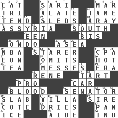 ACROSS 1. Consume 4. Indian skirt 8. Make imperfect 11. Three (prefix) 12. Having winglike extensions 14. Docile 15. Watch over 17. Bobsleighs 18. Like ___ of sunshine 19. Nineveh was its capital 21. _ pole 23. Car or cant ending 24. Twice 25. Southwest Nigerian state 27. Toward the sea 30. Basketball assoc. 31. A viewer who gazes fixedly 34. Numbers guy (abbr.) 37. A really long time 38. Leaves out 39. Being at a high temperature 40. Beverage made from leaves 41. Makes clutter 43. Period 44. French philosopher Descartes 45. Small pie 47. Adept person 49. Auto 50. Vital fluid 52. Elected representative 56. Thick slice 57. Country residence 60. The founder of a family 61. ____ d'Azur (French Riviera) 62. Frees from moisture 63. Baking dish 64. Frozen water 65. Assistant 66. Working for oneself (abbr.) DOWN 1. Singer James 2. Ancient Greek god of war 3. Metal containers 4. Indian antelope 5. Silent film actress Nazimova 6. Actress Charlotte 7. It would 8. Shops 9. Nursemaid 10. Marina Del _, California 13. Double-curved letter 14. "Change" in Tahitian 16. Colored 20. Vintage cars 22. Chief or king in Benin or Nigeria 25. Mitch Miller's instrument 26. Nanny 27. Originate 28. Puts into a specified state 29. Celtic language 30. Fish or hair follower 32. Heavy book 33. So be it 34. "Mermaids" star 35. Left side of a ship or aircraft 36. "One Day ___ Time" 42. Comedian Laurel of Laurel & Hardy 44. Friend of Pooh 46. Ancient river in northeast Turkey 47. Food holder 48. Loose flowing garment 49. Stop 50. Group of countries in special alliance 51. Movie disc 52. Downhill vehicle 53. Native american tent (variation) 54. NW Algerian seaport 55. Tear apart 56. _-fi 58. Lyricist Gershwin 59. Cards in a Roman deck?