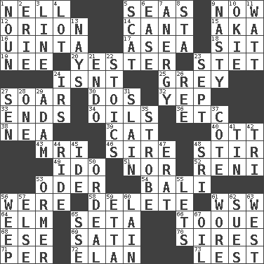 ACROSS 1. 1994 drama film starring Jodie Foster 5. Oceans 9. At this time 12. Greek mythologigal hunter 14. Patter 15. Alias (abbr.) 16. National forest in Provo, Utah 17. Toward the sea 18. Be seated 19. Born 20. Last 23. Proofreading order 24. Is not 25. Jennifer or Joel 27. Fly high 30. Two (Sp.) 32. Slangy assent 33. Extremities 34. Lubricates 36. And so on (abbr.) 38. Teachers' org. 39. Domesticated feline 40. Baseball player Mel 43. Medical imaging device (abbr.) 46. Male parent of an animal 48. Use a swizzle stick 49. Wedding promise 51. Or not 52. Painter Guido (1575-1642) 53. Baltic tributary 54. Indonesian resort city 56. Past tense of be (plural) 58. Erase 61. Compass dir. 64. Shade tree 65. Bristle 66. Woman's close-fitting hat 68. Compass dir. 69. Suttee (variant) 70. Begets 71. For each 72. Liveliness 73. For fear that DOWN 1. Part of speech 2. 4th largest of the Great Lakes 3. Actor's bit 4. Car dealer's back yard 5. Go away! 6. Comfort 7. Disorder of the immune system 8. R.R. building 9. Thoroughly unpleasant 10. Migrant worker of the '30s 11. Electrical Unit 13. Negative votes 21. Inside; within (prefix) 22. Unemotional ones 23. Back-to-school mo. 24. Big collection agency 26. To separate or throw off 27. Elected rep. 28. Single 29. First of billions? 31. Killed 35. Disco prop 37. ____ d'Azur (French Riviera) 41. Metal container 42. Three (prefix) 44. Travel on or in a vehicle 45. Binary compound 47. Part of Q.E.F. 48. Indian title of respect (Mr.) 50. Severe or trying experience 53. Abalone 55. Allows 56. Shed a tear 57. Otherwise 59. Singer James 60. (Had) reclined 61. Had on 62. Institutes legal proceedings 63. 270 degrees 65. Compass dir. 67. Petroleum