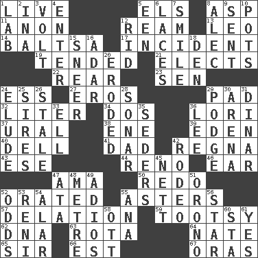 ACROSS 1. Not recorded 5. Raised railways 8. Viper 11. Soon (poet.) 12. 480, 500 or 516 sheets of paper 13. Lion 14. Greek mezzo-soprano Agnes 17. Happening 19. Watched over 21. Opts 22. Bring up, as a child 23. Elected rep. 24. Curvy letter 27. Greek god of love 29. Writing tablet 32. 61 cubic inches 34. Two (Sp.) 36. Australian parrot (variant) 37. Mountain range 38. Compass dir. 39. Paradise 40. Small valley 41. Male parent 42. Canadian anthropologist Darnell 43. Compass dir. 44. Former U.S. Attorney General Janet 46. Ewer handle 47. Nursemaid (var.) 50. Make new 52. Spoke pompously 55. Michaelmas daisies 57. Conveyance 59. A girl or young woman (variant) 62. Heredity factor (abbr.) 63. Roll call or roster of names 64. Nathan's nickname 65. Title for a knight 66. Eastern Standard Time (abbr.) 67. Mouths or openings DOWN 1. Experiment locale 2. _ tizzy (2 wds.) 3. Electrical Unit 4. Keyboard key 5. Car or cant ending 6. Shoestrings 7. Grin 8. Actor Baldwin 9. Posted 10. Plant holders 12. To free from 15. Scornful expression 16. The sixth month of the Jewish calendar 18. Lair 20. Eaten away 24. Dodge 25. Founders of families 26. Showing deterioration from age 28. Underwater navigation system 29. Plash 30. Sports stadium 31. Middle Eastern gold or silver currency 33. Pipe bend 35. Spring feasts 36. Area sheltered from the wind 42. Cowboy competition 45. Remaining after all deductions 47. "One Day ___ Time" 48. Distance measurement (Brit.) 49. Goodbye (Sp.) 51. U. of Maine site 52. Probability 53. Painter Guido (1575-1642) 54. Having or resembling wings 55. Santa ___, CA 56. Play the lead 58. Baseball player Mel 60. R.R. building 61. Affirmative reply