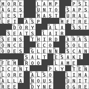 ACROSS 1. Greater amount 5. Desk light 9. 23rd letter of the Greek alphabet 12. Grows older 13. To (old English) 14. Plant excrements 15. For fear that 16. Vertical spar for supporting sails 17. Mountain range 18. Luau accessory 19. Viper 21. Distance measurement (Brit.) 22. Rowboat 24. In the manner of 26. Fast jet (abbr.) 27. Theater features 28. Den 29. Elected reps. 30. One of three equal parts 32. Ancient river in northeast Turkey 36. Single time 37. Environmental prefix 38. Flatfish 39. Lyric poems 40. American astronaut and politician John 42. Glance over 43. Table seasoning 44. 1973 Nobel Price Winner (Physics) Leo 46. Opposite of masc. 49. Friend of Pooh 50. Unable to walk 51. Ancient Celtic tribe of eastern Britain 53. Travel a route regularly 54. Nine, plus one 57. Old wives' tales, e.g. 58. In addition 61. Pale green bean 62. Silent film actress Nazimova 63. Common sense 64. A single undivided whole 65. To riddle 66. Unit of force 67. Legendary monster DOWN 1. Shopping center 2. Double curve, resembling the letter S 3. Dwelling 4. Eastern Standard Time (abbr.) 5. Mass 6. Santa ___, CA 7. Mountains (abbr.) 8. Cooking vessel 9. Actors' quests 10. Practice fights 11. Small island 14. Institute legal proceedings 19. Nonscientific branch of learning 20. System (abbr.) 21. Spoil 23. Fertile tracts in a desert 24. Composer Copland 25. Hat (slang) 27. Transmit 28. It is permitted: Lat. 29. "Barney Miller" actor Jack 31. Phone greeting 32. Indian state 33. Shooting up abruptly 34. Jai ____ 35. Elected rep. 40. E Mali city 41. 1994 drama film starring Jodie Foster 43. Indian title of respect (Mr.) 45. Declare 46. Having threads 47. Learning spot: Fr. 48. Haggard of country music 52. Teachers' org. 53. Airs 55. Independent ruler or chieftain 56. Nathan's nickname 58. Plus 59. Myrna of the movies 60. Player for Phoenix 61. Nilotic language