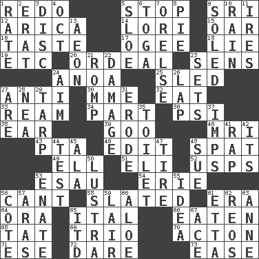 ACROSS 1. Redecorate 5. Constrict 9. Indian title of respect (Mr.) 12. N. Chile seaport 14. Australian parrot (variant) 15. Boat paddle 16. Clothes sense 17. Double curve, resembling the letter S 18. Untruth 19. And so on (abbr.) 20. Severe or trying experience 23. Elected reps. 24. Small Philippine buffalo 25. Downhill vehicle 27. Opposed to 30. Madame (abbr.) 32. Ingest 33. 480, 500 or 516 sheets of paper 34. Piece 36. 23rd letter of the Greek alphabet 38. Hearing organ 39. Thick or sticky substance 40. Medical imaging device (abbr.) 43. Parent Teacher Association (abbr.) 46. Prepare for publication 48. Argument over a trivial matter 49. Pipe bend 51. Biblical high priest 52. United States Postal Service (abbr.) 53. He sold his birthright 54. 4th largest of the Great Lakes 56. Patter 58. Scheduled 61. Period 64. Mouth or opening 65. Slanted text style (abbr.) 66. Eroded 68. Make lace 69. Musical group of three 70. 13-14th century defensive garment 71. Compass dir. 72. Have the gumption 73. Comfort DOWN 1. Assign a rank or rating to 2. Part of Q.E.F. 3. Flat circle 4. Sep. follower 5. A type of plum 6. Ancient Roman robe 7. Threatening words 8. Sliced dessert 9. Having a sole or soles 10. Water falling in drops from the sky 11. Angers 13. A really long time 21. Frolic 22. Break 23. Puts into a specified state 24. Direct toward a target or goal 26. Pet locale 27. "We ___ not amused" (Victoria) 28. Teachers' org. 29. Canvas cover 31. Wear away 35. Bathroom 37. Naughty children 41. Reproach for some lapse or misdeed 42. It is 44. Trial 45. Wing 47. Hoop that covers a wheel 48. Take to court 50. A period of five years 53. Maternal 55. The content of cognition 56. ____ d'Azur (French Riviera) 57. Ancient river in northeast Turkey 59. Den 60. Medicinal plant 61. Singer James 62. Vintage cars 63. Queen of England 1702-14 65. It would 67. Adept person