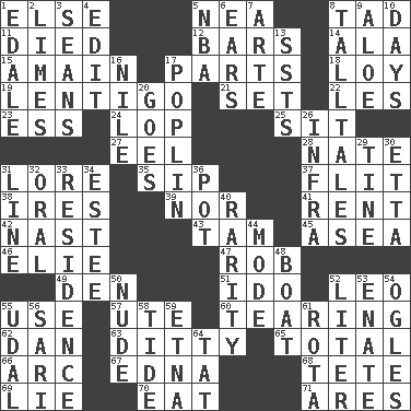 ACROSS 1. Otherwise 5. Teachers' org. 8. Bit 11. Passed on 12. Taverns 14. According to 15. At full speed 17. Actors' quests 18. Myrna of the movies 19. Small, flat, pigmented spot on the skin 21. Put into a specified state 22. French article 23. Curvy letter 24. Trim (branches) 25. Be seated 27. Snakelike fish 28. Nathan's nickname 31. Old wives' tales, e.g. 35. Small drink 37. Sudden quick movement 38. Angers 39. Or not 41. Monthly bill 42. Political cartoonist Thomas 43. Scottish cap 45. At sea 46. Writer Wiesel 47. Director Reiner 49. Lair 51. Wedding promise 52. Lion 55. Purpose 57. Shoshoni 60. Pulling into pieces 62. One of the 12 tribes of Israel 63. Short, simple song 65. "_____ Recall" 66. Curve 67. Pulitzer Prize-winning author Ferber 68. False hair 69. Falsehood 70. Erode 71. Ancient Greek god of war DOWN 1. Peak District village in England 2. Citrus fruits 3. Seines 4. Prepare for publication 5. Basketball assoc. 6. Hearing organs 7. Johnson of "Laugh-In" 8. Baron Munchausen's specialties 9. Medicinal plant 10. 24-hour periods 13. Fast planes 16. The longest river in the world 17. Cotton for raincoats, e.g. 20. Moves 26. Kind of red light 29. Prong on a fork 30. Singer James 31. Actor's bit 32. Spoken 33. Dwelling 34. First name in cosmetics 36. Plant holder 40. Noteworthy scarcity 44. Method 48. Water vessel 50. Unadorned 52. 61 cubic inches 53. Related on the mother's side 54. Stares at amorously 55. Freehold land 56. Indian skirt 58. Periodic rise and fall of the sea level 59. Inactive volcano in Sicily 61. Roll call or roster of names 64. Make lace
