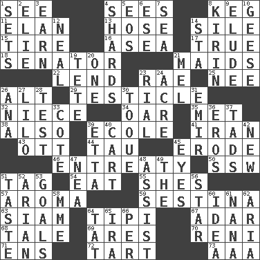 ACROSS 1. Observe 4. Observes 8. Barrel 11. Enthusiasm 13. Stockings 14. Drop; flow; fall 15. Become fatigued 16. Toward the sea 17. Loyal 18. Elected representative 21. Women servants 22. Grant temporary use of 23. Actress Charlotte 25. Born 26. The first octave above the treble staff 29. One of the two male reproductive glands 32. Sibling's daughter 34. Rowing implement 35. Was introduced to 38. In addition 39. Learning spot: Fr. 41. SW Asia republic 43. Baseball player Mel 44. The 19th letter of the Greek alphabet 45. Wear away 46. Plea 50. Compass dir. 51. Label 54. Consume 55. "______ My Girl" (Turtles hit) 57. Scent 59. French poetic form 63. Thailand, formerly 64. Native american tent (variation) 67. The sixth month of the Jewish calendar 68. Falsehood 69. Ancient Greek god of war 70. Painter Guido (1575-1642) 71. Followers of ems 72. Small pie 73. American Automobile Association (abbr.) DOWN 1. Puts into a specified state 2. Writer Wiesel 3. Merit 4. Broken pieces 5. Greek goddess of the dawn 6. Compass dir. 7. Ocean 8. Japanese brewing company 9. Evade 10. Honkers 12. Anneal 14. R.R. building 19. False hair 20. Single 21. Cartoonist voice _ Blanc 23. Monetary unit of Yemen 24. 43,560 square feet 26. Santa ___, CA 27. _ and Stitch 28. Trial 30. Woman's close-fitting hat 31. Independent ruler or chieftain 33. ____ d'Azur (French Riviera) 36. Greek god of love 37. Small amounts or degrees 39. Singer James 40. Draw slowly or heavily 42. ___ Haven, CT 45. Sight organs 47. Teachers' org. 48. Help 49. Definite Article 51. Clothes sense 52. Believer in; advocate of (suffix) 53. Finish lines 56. Play the lead 58. Madame (abbr.) 60. It may be bright or harebrained 61. Nanny 62. Operatic vocal solo 64. Make lace 65. Retirement account (abbr.) 66. For each