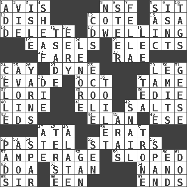 ACROSS 1. Deliberation 5. Overdraft (abbr.) 8. Be seated 11. Food container 12. ____ d'Azur (French Riviera) 13. White ___ sheet 14. Erase 17. Residence 19. Artist's stands 21. Chooses 22. Conductor's collection 23. Actress Charlotte 24. Island 27. Centimeter-gram-second unit of force 29. Part of a journey 32. Elude 34. Sep. follower 36. Not wild 37. Australian parrot (variant) 38. Friend of Pooh 39. Singer Brickell 40. Actor's bit 41. Connecticut Ivy Leaguer 42. Table seasonings 43. Begley and Asner 44. Flair 46. Compass dir. 47. "One Day ___ Time" 50. Part of Q.E.F. 52. Soft color 55. Flight of steps 57. Electrical Measurement 59. Slanted 62. ___ good deed 63. Comedian Laurel of Laurel & Hardy 64. Billionth: prefix 65. Title for a knight 66. Car or cant ending 67. Conclusions DOWN 1. Say or write further 2. Compete 3. Capri or Wright 4. Archer's quiver 5. Immediately 6. Navigate 7. Man or boy (slang) 8. Ketch in the Levant 9. Is not 10. Labels 12. Music discs 15. Sadhe (variant) 16. Suggestive of the supernatural 18. Area sheltered from the wind 20. Poe poem 24. Cell (Danish) 25. Stay clear from 26. Tall tales 28. Learning spot: Fr. 29. Dipping utensil 30. Sends forth 31. Honkers 33. Pass on 35. Rest room 36. Beverage made from leaves 42. Slow-paced one 45. Ancient river in northeast Turkey 47. Had dinner 48. Laconic 49. Having winglike extensions 51. Heavy duty weighing machine 52. Writing tablets 53. Mine, in Marseilles 54. Practice fight 55. Elected rep. 56. Connect, as a bridge 58. Separate the seeds from cotton 60. Conclude 61. Two (Sp.)