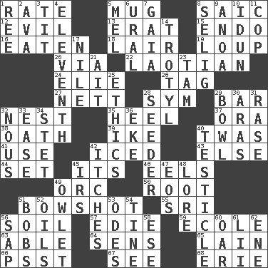 ACROSS 1. Pace 5. Large cup 8. Ketch in the Levant 12. Morally bad or wrong 13. Part of Q.E.F. 15. Inside; within (prefix) 16. Consumed 18. Den 19. Central Nebraska county 20. By way of 22. Of or relating to Laos or its people 24. Writer Wiesel 26. Label 27. Remaining after all deductions 28. Symbol (abbr.) 29. Soap unit 32. A home for chicks 35. Person who is morally reprehensible 37. Mouth or opening 38. Pledge 39. Eisenhower's nickname 40. It was, poetically 41. Purpose 42. On the rocks 43. Otherwise 44. Put into a specified state 45. It is 46. Snakelike fish 49. The grampus (Milton) 50. Carrot, for example 51. The distance a bow sends an arrow 55. Indian title of respect (Mr.) 56. Earth 57. Singer Brickell 59. Learning spot: Fr. 63. Competent 64. Elected reps. 65. (Had) reclined 66. Inconspicuous attention getter 67. Observe 68. One of the Great Lakes DOWN 1. Portuguese money of account (variant) 2. Actress Gardner 3. Teat (slang) 4. Veterans Day date 5. Cartoonist voice _ Blanc 6. Mountain range 7. Greek goddess of the earth (variant) 8. Former Milwaukee Brewers owner Bud 9. Small Philippine buffalo 10. Goddess of spring and wife of Bragi 11. Police officer (slang) 14. TNT 17. The longest river in the world 21. Small island 23. Scottish cap 25. Moral principles 28. Sowing specialist 29. Soup holder 30. Ancient river in northeast Turkey 31. Raze (variant) 32. Horse sense 33. Comfort 34. Proofreading order 36. Make supply last 40. One of the two male reproductive glands 42. Skin irritations 45. Big collection agency 47. Greek goddess of the dawn 48. Old wives' tales, e.g. 49. A small or young owl 51. Moves up and down 52. Petroleums 53. Lyric poems 54. Prong on a fork 56. Plant excrement 58. Compass dir. 60. Rowing implement 61. Cards in a Roman deck? 62. Compass dir.