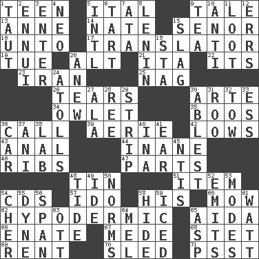 ACROSS 1. Adolescent 5. Slanted text style (abbr.) 9. Falsehood 13. Singer Murray 14. Nathan's nickname 15. Sir (Sp.) 16. To (old English) 17. Interpreter 19. Third day of the wk. 20. The first octave above the treble staff 21. Call ___ day 22. ___ a Wonderful Life 23. SW Asia republic 25. Tired old horse 26. Lacerates 30. Johnson of "Laugh-In" 34. A small or young owl 35. Scornful sounds 36. Give a ring to 39. Nest on high 42. Moos 43. Of or related to the anus 44. Empty; void 46. Chest bones 47. Components 48. Shallow baking pan 51. Detail 54. Music discs 57. Wedding promise 58. Part of HMS, perhaps 60. Cut the grass 62. Under the skin 65. Opera by Verdi 66. Related on the mother's side 67. Ancient Persian 68. Proofreading order 69. Monthly bill 70. Downhill vehicle 71. Inconspicuous attention getter DOWN 1. Pulled tight 2. World-weariness 3. Keyboard key 4. Modern: prefix 5. International (abbr.) 6. Small pie 7. "One Day ___ Time" 8. Soviet premier 1918-24 9. Afternoon social gathering 10. Opposed to 11. Spoils 12. Blunders 15. Volcanic refuse 18. R.R. building 20. Afresh 24. Ringlike coral islands and reefs 27. Chicken ___ king 28. To riddle 29. Long narrow piece of something 30. Most capable 31. Friend of Pooh 32. Pull behind 33. Double-curved letter 36. 4-wheeled motor vehicle 37. Cuckoo 38. Experiment locale 40. _ tizzy (2 wds.) 41. Ewer handle 45. Nuclear Threat Initiatives 48. Event that recurs at intervals 49. Binary compound 50. Typical standards 52. Sends forth 53. Methods 54. "Mermaids" star 55. Centimeter-gram-second unit of force 56. Connect, as a bridge 58. Flintstone garb 59. On the rocks 61. Electrical Unit 63. Baseball player Mel 64. Cartoonist voice _ Blanc 65. Cleo's killer